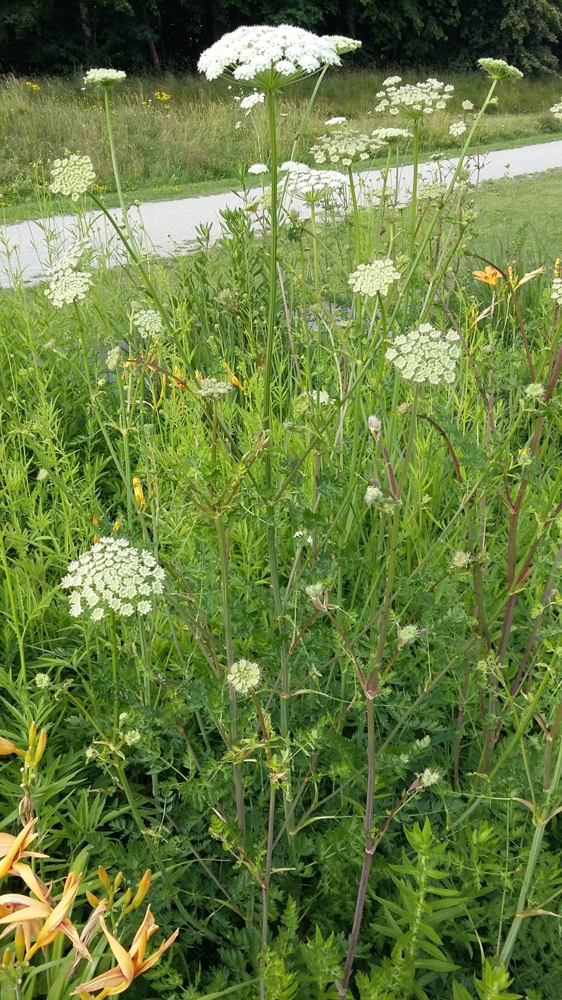 ich suche den Namen dieses Korbblütlers, der der Wilden Möhre zwar ähnlich sieht, aber den schwarzen Punkt in der Blüte vermissen lässt. Sie steht in einem Staudenbeet, ist aber nicht gepflanzt. Der Stiel ist rötlich und die Pflanze wird 1,70 m hoch.