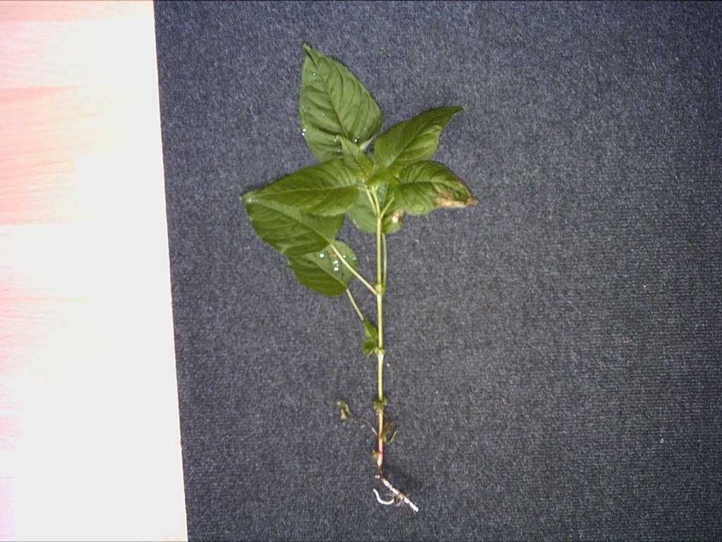 Das größte Blatt ist jetzt 8cm breit und 12 cm lang. 2 Blätter gegenständig, in den Blattachseln 2 weitere winzige Blättchen. Auf der Blattoberseite sind silberne Härchen, auch der Stengel ist behaart, wie bei Franzosenkraut. Die längste Internodie ist 7 cm lang. Die Pflanze ist leicht auszureissen und scheint sich durch unterirdische Wurzeln zu verbreiten. Sie kommt in großen Mengen sehr dicht vor, viele Quadratmeter.