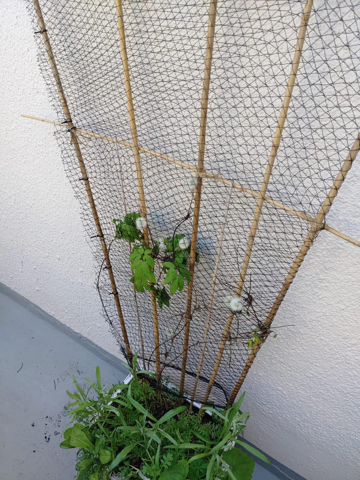 Heute morgen musste ich feststellen, dass meine kleine Clematis (alpina ssp. sibirica), die ich seit ca einem Jahr habe, über Nacht komplett vom Wind zerlegt wurde. Sie steht an der Nordwand meines Balkons, der befindet sich in einer Art Innenhof, der zu einer Seite offen ist, wo der Wind schon mal ziemlich herumwirbeln kann, sowas ist mir aber bisher nicht passiert und es war ja nicht mal ein Sturm. Ich habe die kaputten Blätter abgeschnitten, nachdem ich den Tipp irgendwo gelesen hatte (keine Ahnung, ob das richtig war) und musste die Stängel erst einmal notdürftig befestigen (ich weiß, dass das so nicht optimal ist, aber soweit sind die Triebe in Ordnung), und werde wohl sobald ich es zum Baumarkt schaffe die ganze Rankhilfe inklusive Triebe mit grobmaschigem Netz umwickeln, um der Pflanze etwas halt zu geben. Habt ihr schon mal Erfahrungen mit sowas gemacht? Wie habt ihr das gelöst?