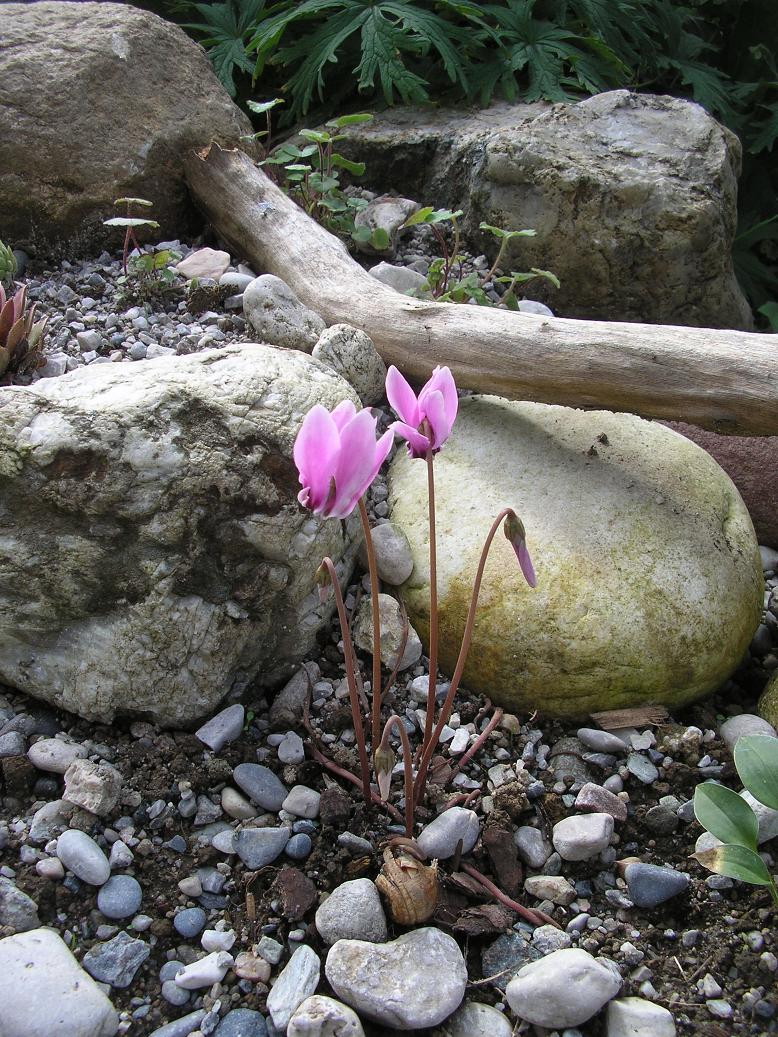 So nun blüht auch das rosafafarbene Cyclamen hederifolium, das ich erst vor zwei wochen in den neuangelegten Steingarten umgpflanzt hatte ganz entzückend