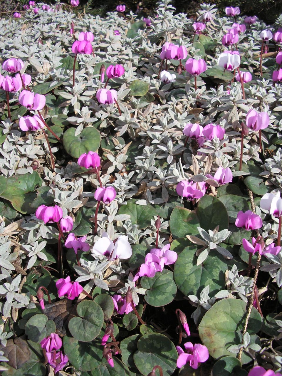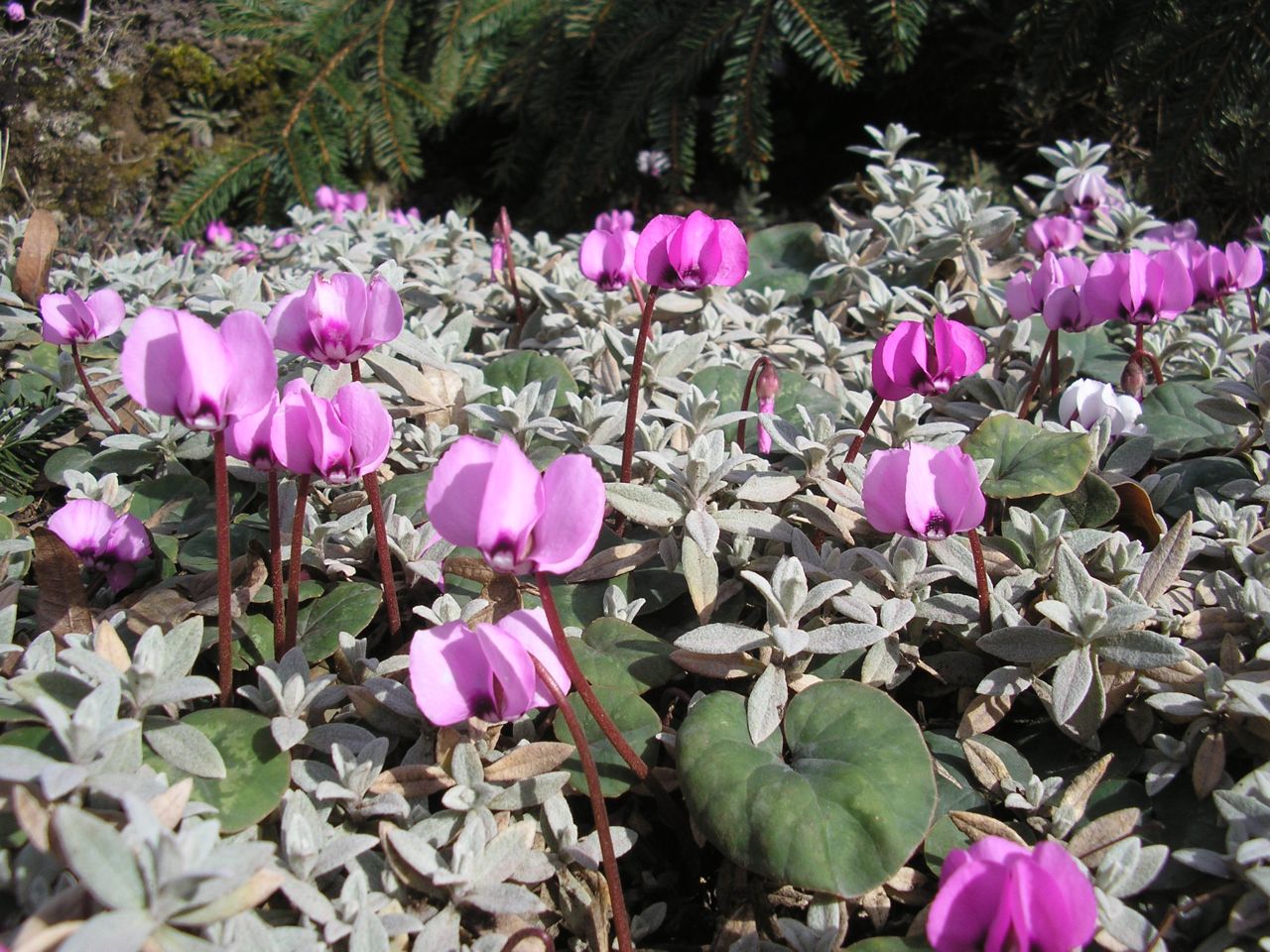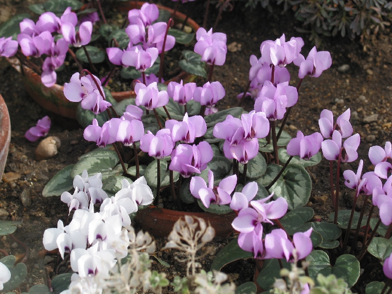Mein weißes ist ein winterhartes. Das hat jetzt schon den dritten WInter draußen überlebt und sich auch brav ausgesäht. ich hoffe das auch die rosaroten Formen bald mit blühen beginnen. Oft tun sie das bis Dezember. Die Zimemralpenveilchen blühen bei mir noch nicht, sondern sind noch voll in ihrer Ruhephase unter der buchenhecke.