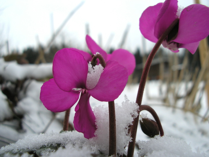 So und jetzt sind auch meine vor(fühlings)witzigen Vorfrühlingsalpenveilchen (Cyclamen coum) etwas unter dem Schnee verschwunden, aber einige Blütchen schaun noch immer keck heraus. Mal schauen... vielleicht verlängert das kühle Wetter ja sogar ihr Blütezeit, weil sie pausieren müssen...