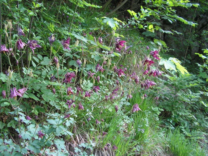 Bild 1: Aquilegia vulgaris wild in Häring (Tiroler Unterland). Sie wächst dort an einem Laubwaldrand und manchmal auch auf Lichtungen und Kahlschlägen, wenn sie die Möglichkeit hat sich dorthin ausszubreiten. Man sieht auf dem Bild auch recht gut, das selbst in der Natur die Farbe der Akelein gerne schwankt.