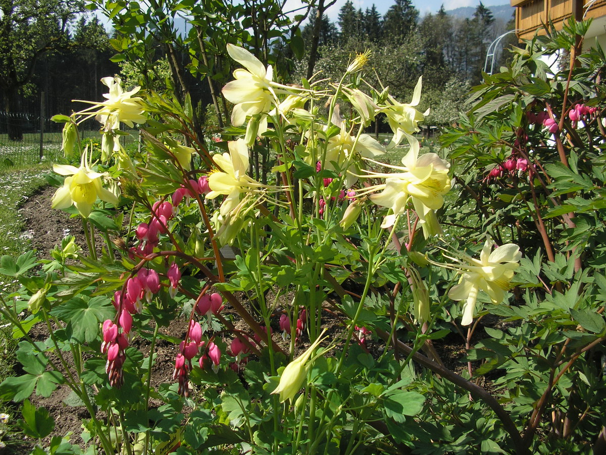 Meine ersten Goldakelein Aquilegia chrysantha) blühen schon voll zusammen mit Kaiserkronen und tränendem Herz, weil sie vorgetrieben waren als ich sie im März pflanzte.