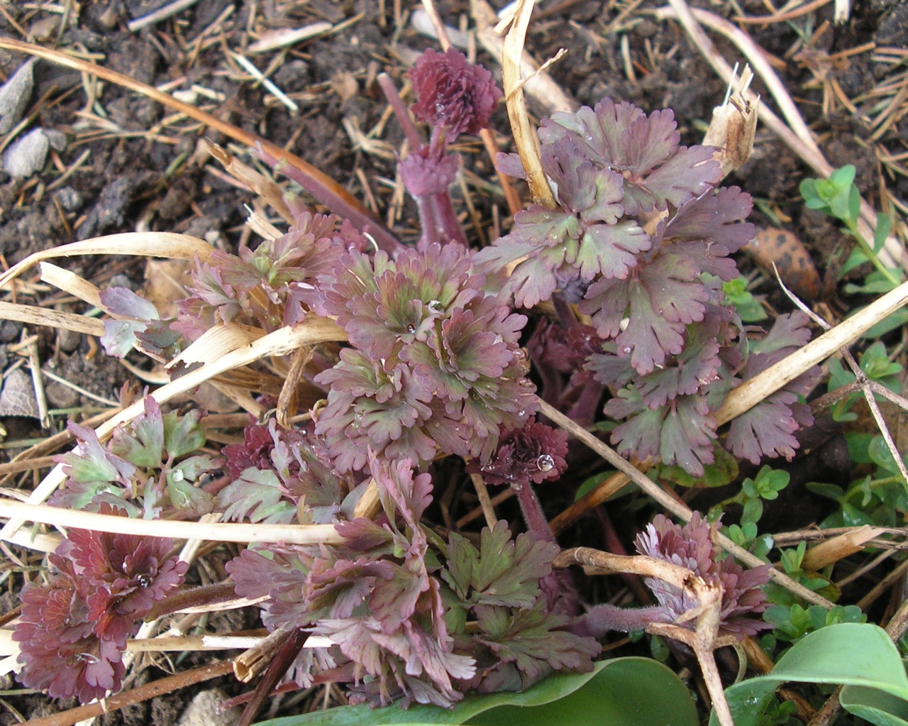 Dafür rühren sich die Akelein im Garten schon fest und treiben kraftvoll und gesund aus. Besonders der dunkelrote Austrieb der Aquilegia formosa ist sehr attraktiv anzusehen