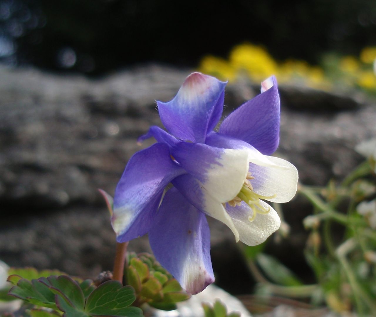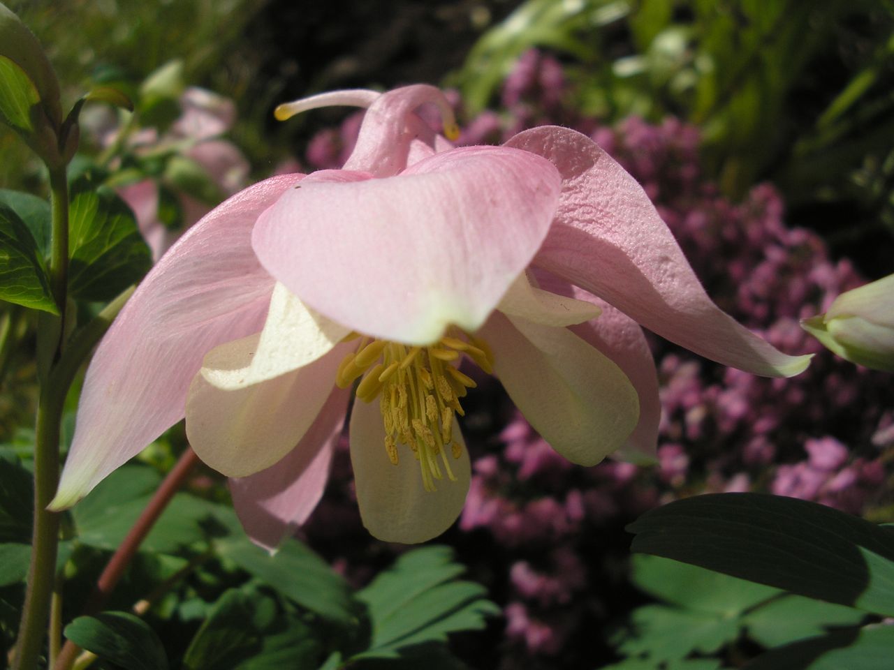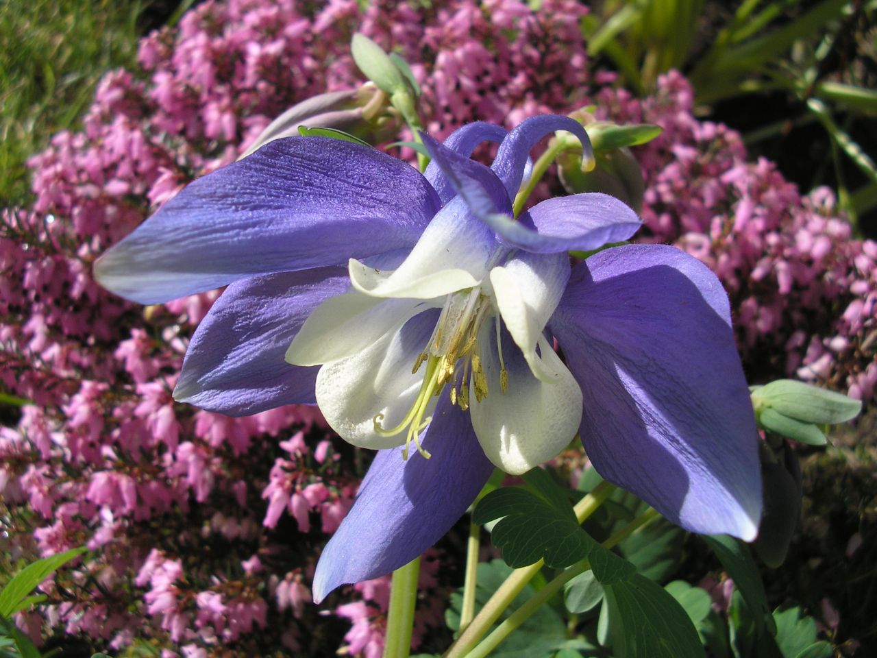 Die ersten nicht vorgetriebenen, sondern überwinterten Akelein im Steingarten blühen