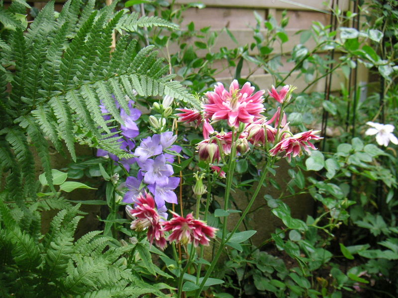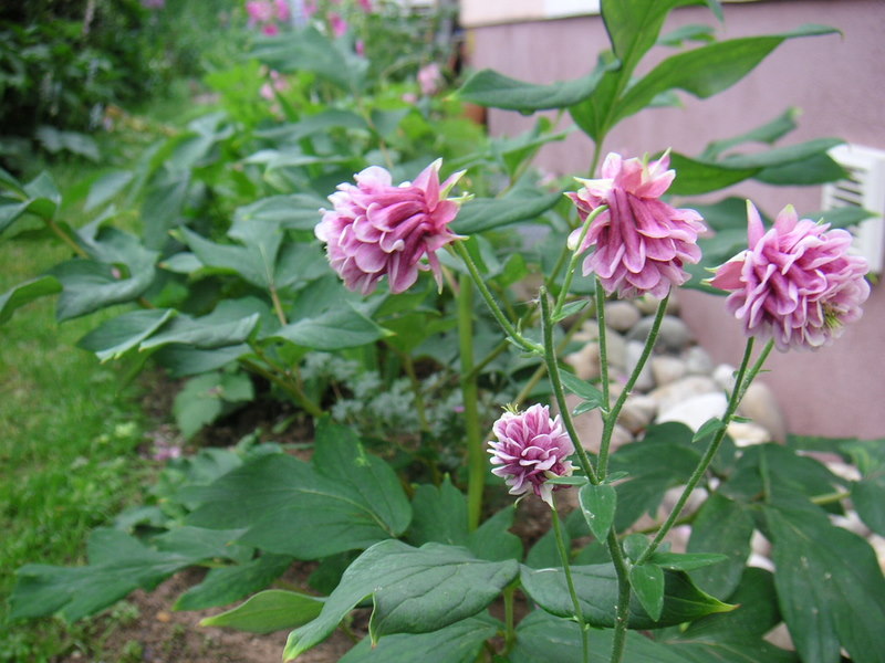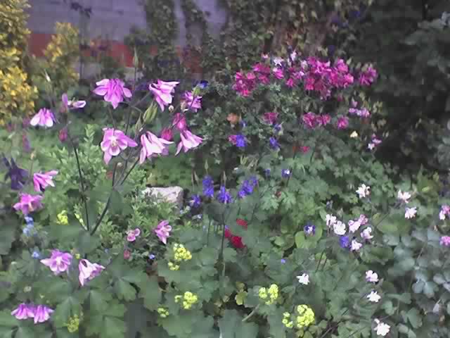 Da ich ja stets mein Handy mit mir herumtrage und oft mit dem Hund in der Siedlung spazierengehe, habe ich hier auch ein Bild aus einem Garten mit Akeleien eingefangen und möchte Euch das nicht vorenthalten.