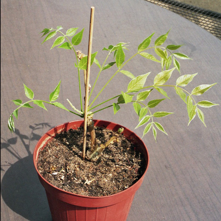 Im Topf eine Veredlung, die grade die ersten Blätter zeigt.