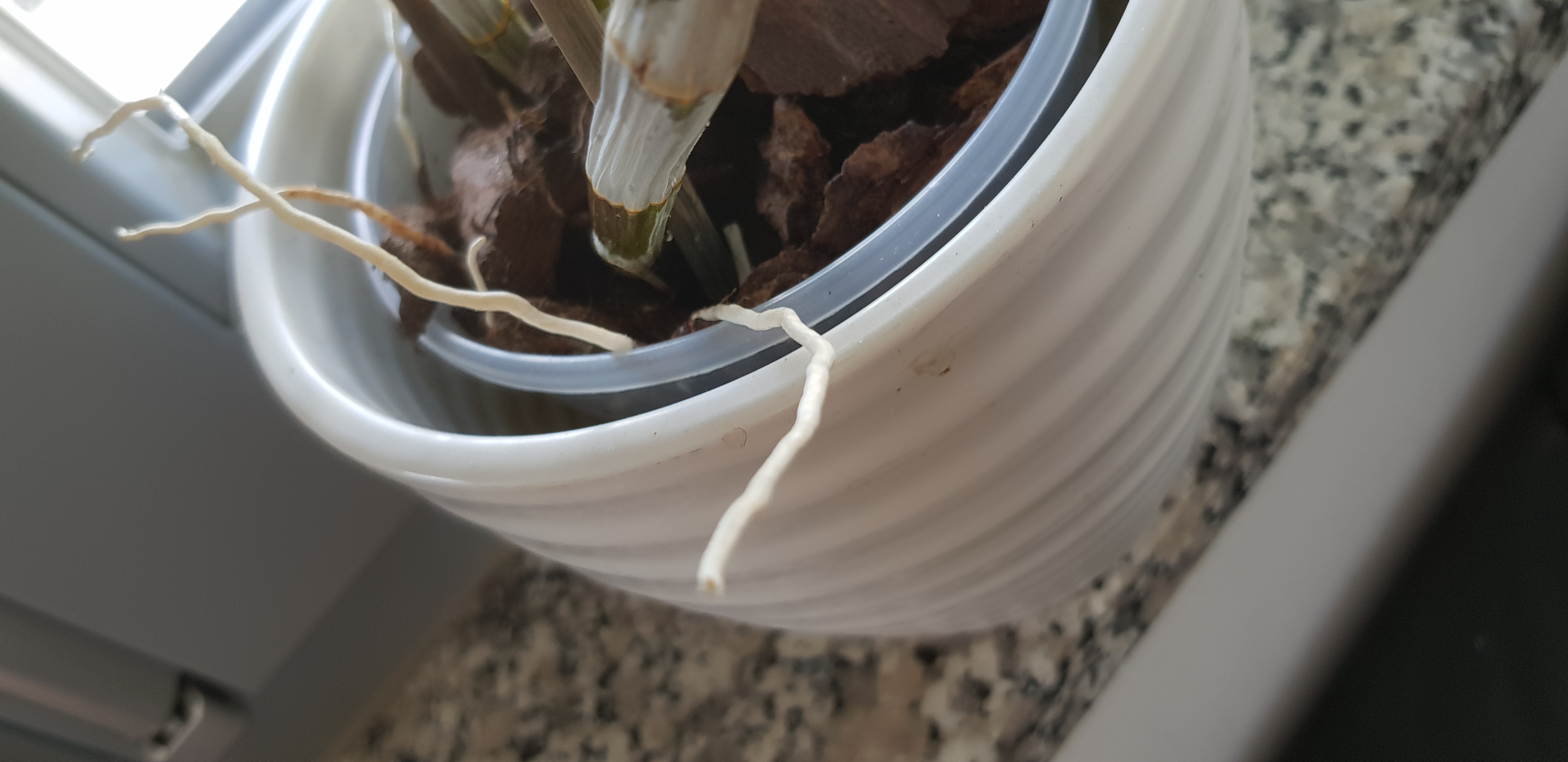 ich hatte aus dem Büro eine eher sterbende Pflanze mit nach Hause genommen. Es sollte eine Orchidee sein. Die hat nur sehr wenige Luftwurzeln. Allerdings nicht wie bei einer Phaleanopsis fleischig und grün, sondern sehr dünn und weiß. Nach langem wässern kurz auch mal grün. Aber nicht vertrocknet. Sie hatte längere Stängel/Triebe zwischen den obersten Blättern, allerdings komplett tot. Nach umtopfen und vorsichtigen gießen sieht sie wieder etwas gesünder aus. Könnt ihr mir einen Tipp geben, wie sie heißt, um mir Pflegeanleitungen zu suchen? Sie soll ja irgendwann wieder blühen. Den Weg in den Müll wollte ich ihr ersparen.