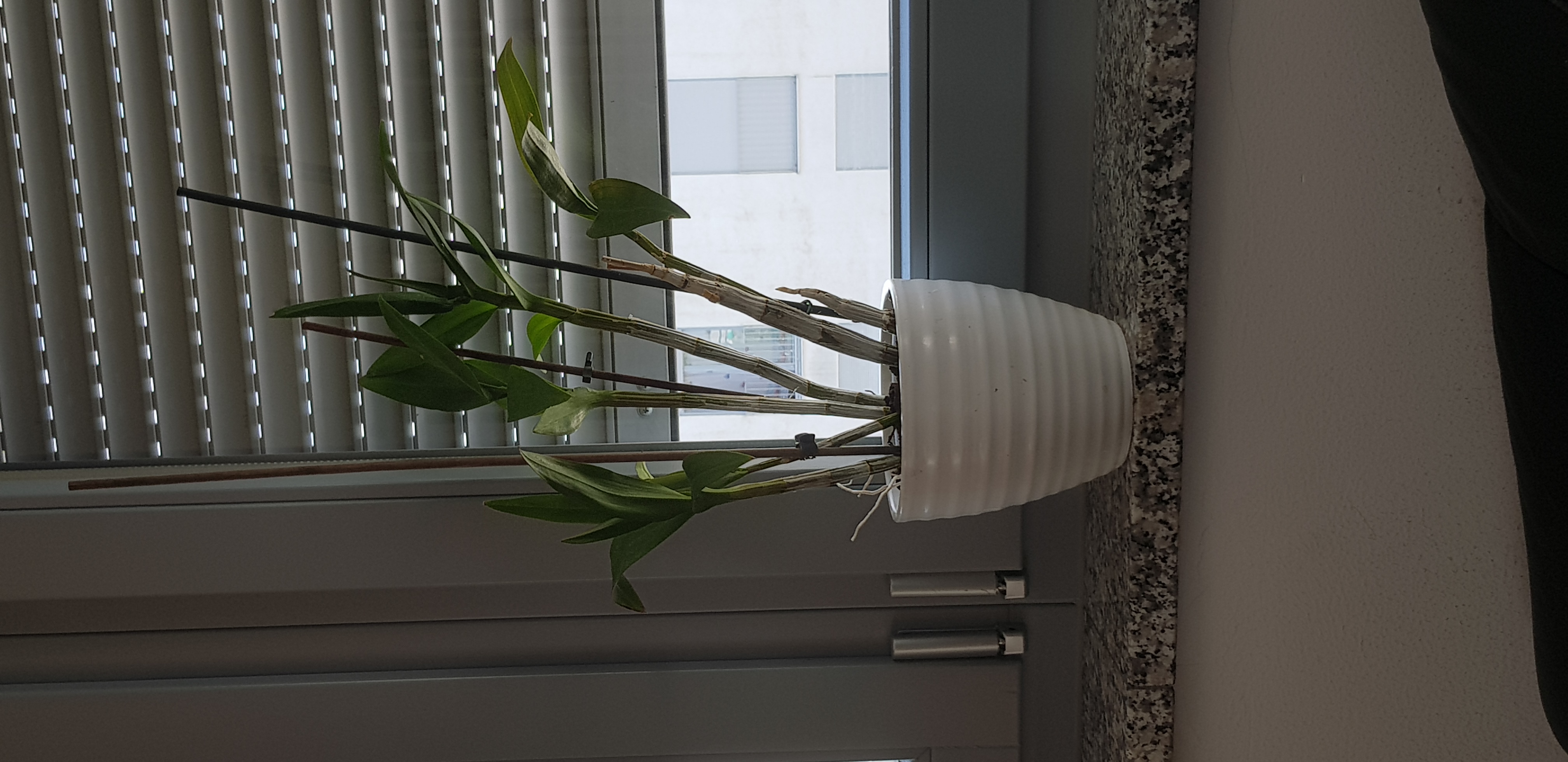 ich hatte aus dem Büro eine eher sterbende Pflanze mit nach Hause genommen. Es sollte eine Orchidee sein. Die hat nur sehr wenige Luftwurzeln. Allerdings nicht wie bei einer Phaleanopsis fleischig und grün, sondern sehr dünn und weiß. Nach langem wässern kurz auch mal grün. Aber nicht vertrocknet. Sie hatte längere Stängel/Triebe zwischen den obersten Blättern, allerdings komplett tot. Nach umtopfen und vorsichtigen gießen sieht sie wieder etwas gesünder aus. Könnt ihr mir einen Tipp geben, wie sie heißt, um mir Pflegeanleitungen zu suchen? Sie soll ja irgendwann wieder blühen. Den Weg in den Müll wollte ich ihr ersparen.