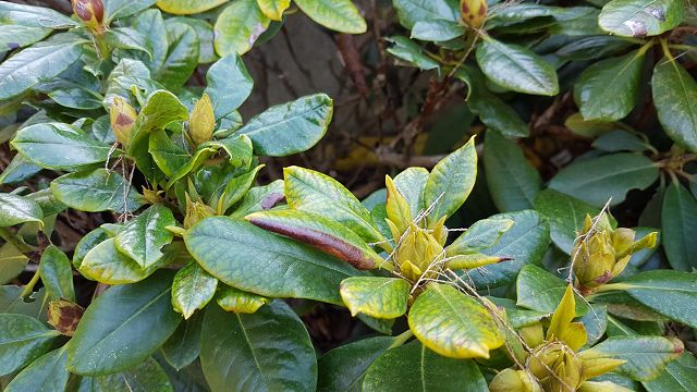 Ich habe vor ein paar Jahren versucht eine Rhododendronhecke anzulegen. Jetzt werden langsam die Blätter kleiner und die Farbe