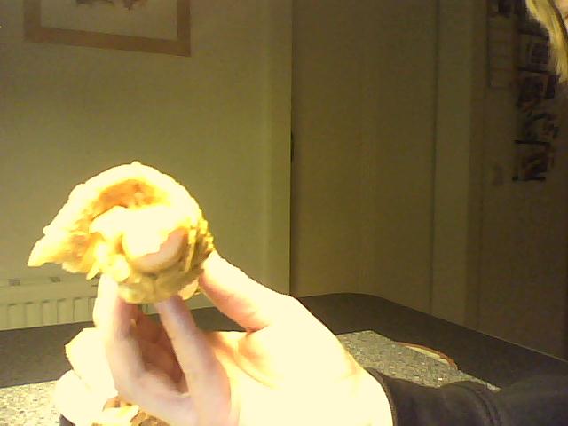 Nun zusammenrollen und oben ein bisschen Remmoulade drauf machen damit der käse hält.