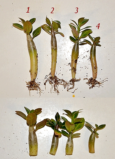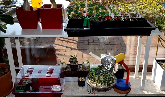 Hallo und an alle, die sich wegen dem Rückschnitt gesorgt haben: Danke für die Aufmerksamkeit und hiermit Entwarnung Das hier sind 4 Keimlinge von insgesamt 8 Adenium arabicum, die auf Seite 52 zu sehen sind. Die waren mir einfach zu lang geraten, obwohl angehäufelt, und ich habe mich daher entschlossen, 4 davon zu köpfen. Aber keine Bange, die bewurzelten Unterteile wurden entsorgt, und die wurzellosen Oberteile sind zum bewurzeln in frisches Substrat umgezogen. Mit dieser ’Aktion’ möchte ich feststellen, ob sich die langen Würste mit der Zeit normalisieren, und wenn nicht Sicherheitshalber wurden 4 von 8 geköpft, in der Hoffnung, dass sie sich bewurzeln und dann auch noch einen ’normalen’ Caudex entwickeln. Wenn natürlich alle 8 überleben und ’normal’ werden sollten, umso besser.