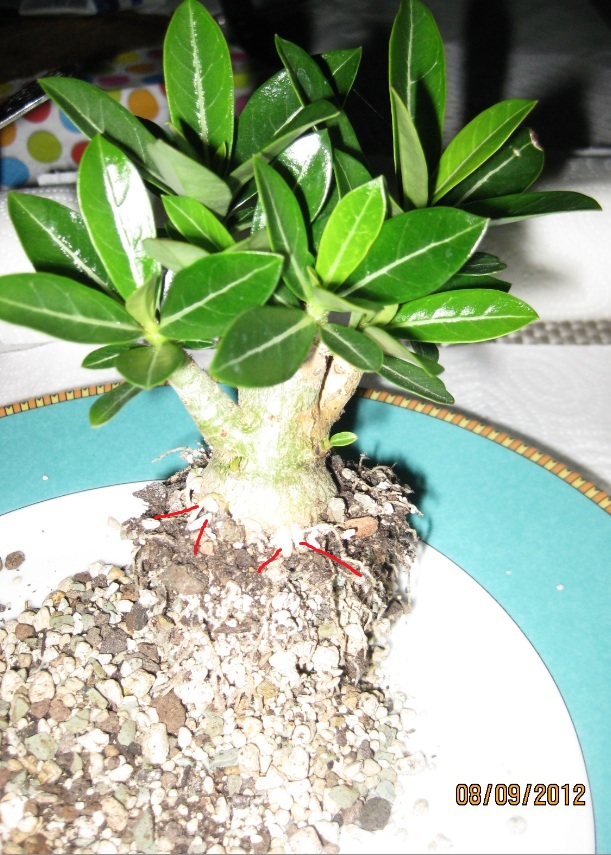 Hier die Bilder. Auf Bild 2 habe ich rote Striche eingesetzt, wo man die neuen, schon etwas dickeren Wurzeln am Caudexrand ein wenig erkennen kann. Leider sind die Bilder nicht so scharf.