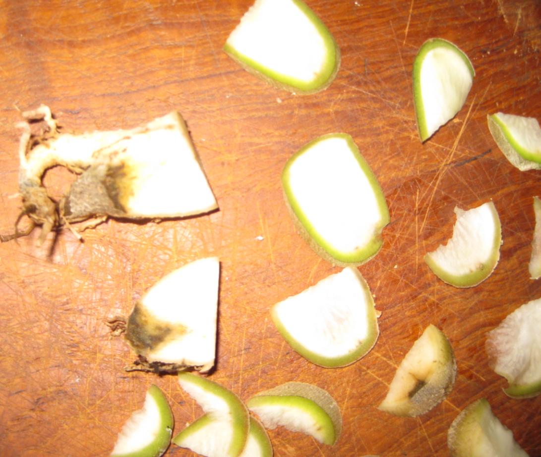 @ Heinze: Da können wir uns nun die Hände reichen, denn ich habe eben auch mal Oberarzt gespielt und die Wüsti mit der Rasierklinge beschnitten. Leider sind gerade die Fotos, auf denen man die dunklere Stelle sieht, sehr hell geworden, sodass man kaum etwas sehen kann. Und nun isse ja auch schon zerteilt. Ich habe zuvor die hellen weichen Wurzeln, die nur noch so lose dran hingen, abgemacht. Der graubraune dunklere Streifen (Faulnis) befand sich nur auf der anderen Seite des Stammes, sieht man hier nicht auf den Bilder, da diese nun leider gerade überbelichtet sind.