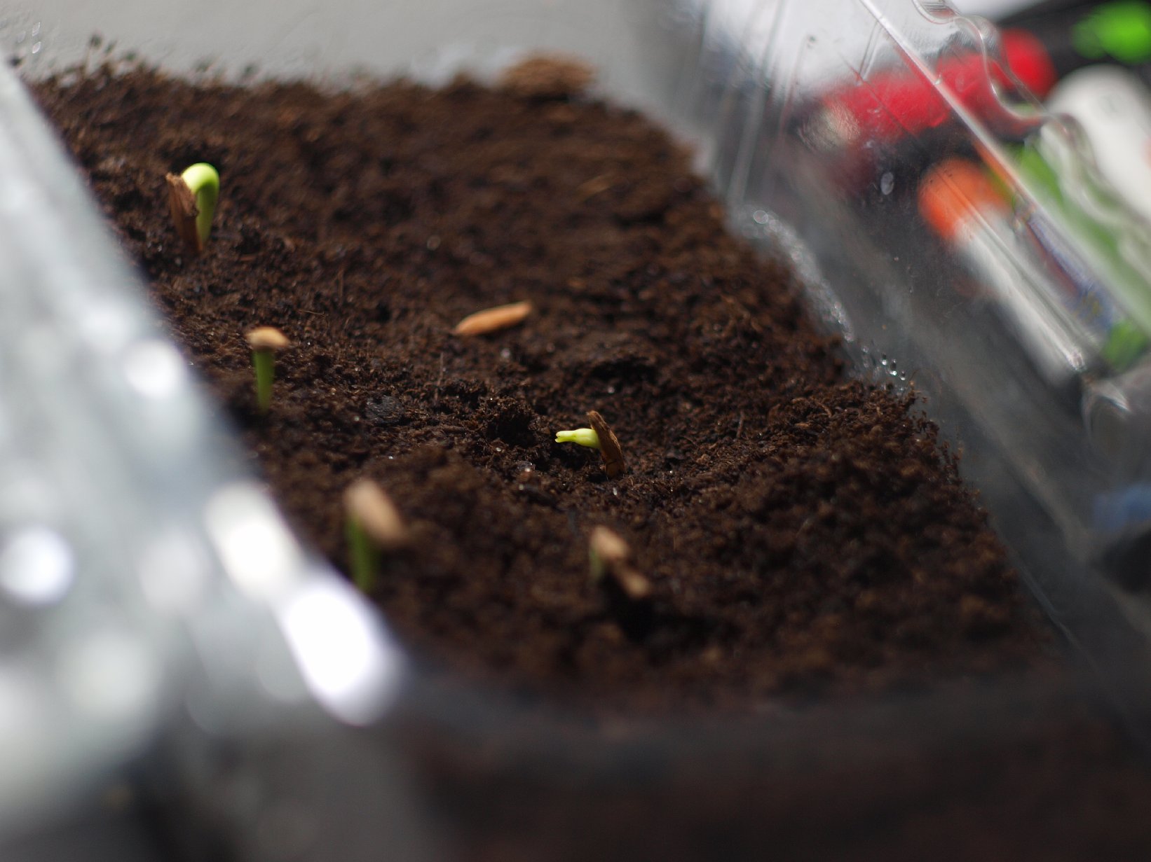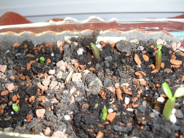 Zuerst habe ich kein Platikbehälter gefunden und deshalb die Samen in eine Kartonbox getan, nach 2 Tagen habe ich dann eine Platikbox von den Weintrauben genommen und die dort untergebracht, wobei die 3 links bereits gekeimt haben. Jetzt keimen 5 von 6 und hoffentlich wird der 6 auch keimen