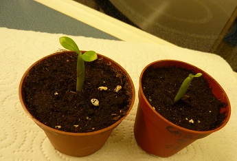 Ich präsentiere mit stolzgeschwellter Brust 2 von meinen 5 Wüsti-Keimlingen. Rechts auf dem Bild seht Ihr den "Chanchon", bei welchem man anfangs keine Keimblätter sah. Inzwischen hat er 3 Blättchen, aber deutlich kleiner als bei den anderen 4ren.