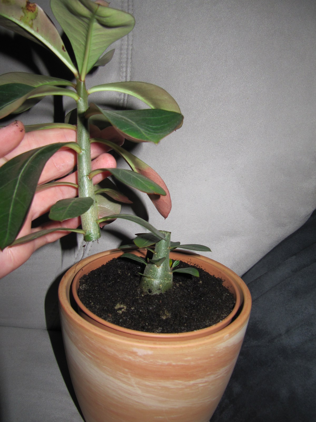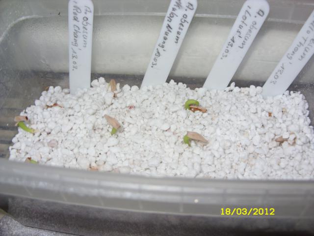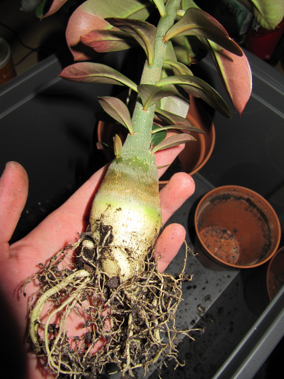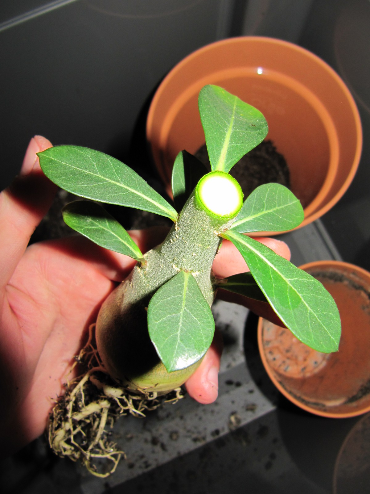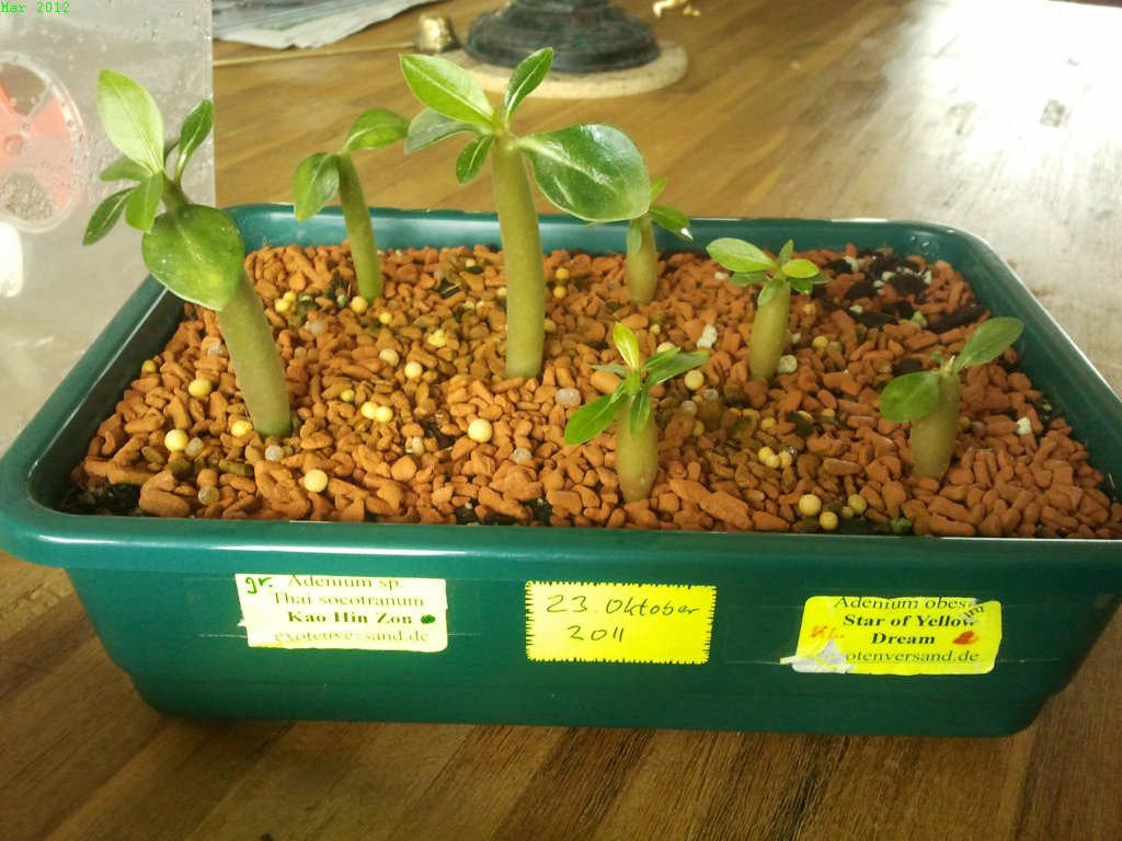Ich habe z.Z. auch 15 Sämlinge. Die sind zusammen mit den Hibiscus rosa sinensis im Zimmergewächshaus gekeimt. Jetzt, wo die Hibiscussämlinge ausgezogen sind, habe ich die kleinen Wüstenrosen etwa 2 cm mit Lechuza-Pon aufgeschüttet. So dürfen sie jetzt noch einige Zeit weiter wachsen.
