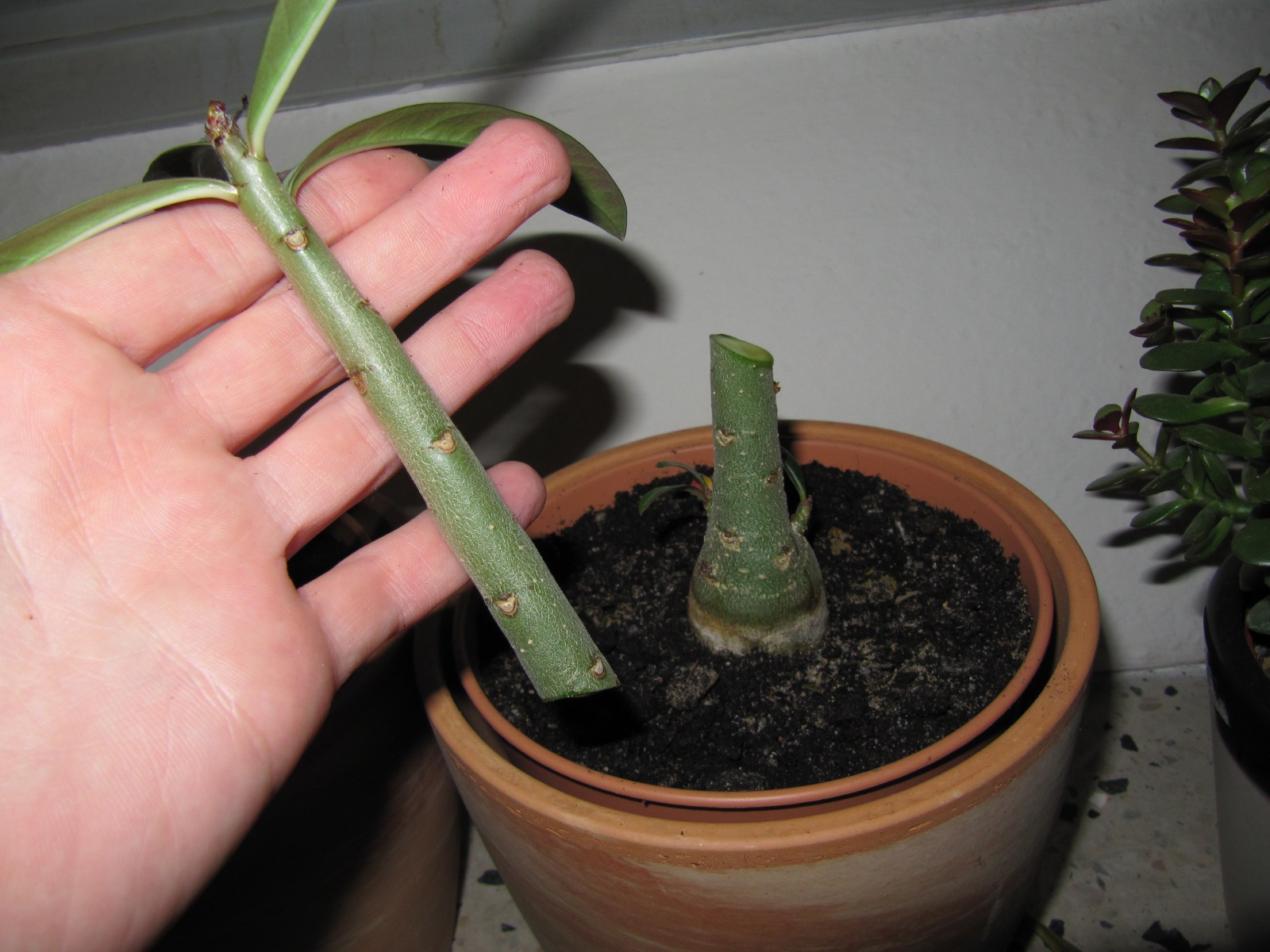 Ich habe bei der Großen einen Zweig entfernt, dort einen leicht V-förmigen Schnitt reingemacht, den kleinen Albino unten angespitzt und in den Schnitt geschoben. Das ganze dann fest verbunden. Bisher sieht er noch genau so aus wie vor der Prozedur. Also nicht schrumpelig oder so.