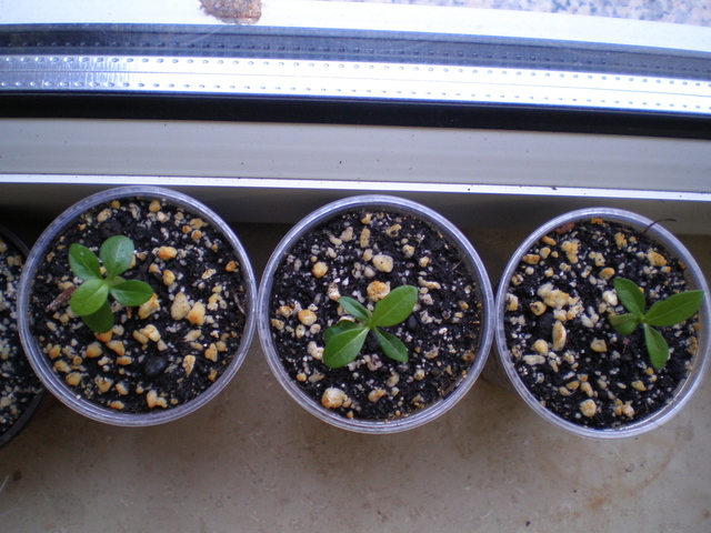 Da sind ein paar Pflanzen die schmale spitze Blätter haben wie die A. somalense normalerweise und andere haben runde Blätter mehr wie Adenium obesum.