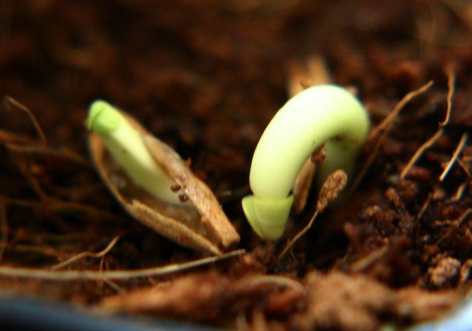 Vorhin konnte ich meine Neugier nicht mehr bremsen und nachdem sich die Samenhülle weiter geöffnet hatte, von der Zweiten aber noch immer keine Wurzel zu sehen war, hab ich mal etwas Geburtshilfe geleistet. Die Hülle ging aber fast schon allein von der "Großen" ab.