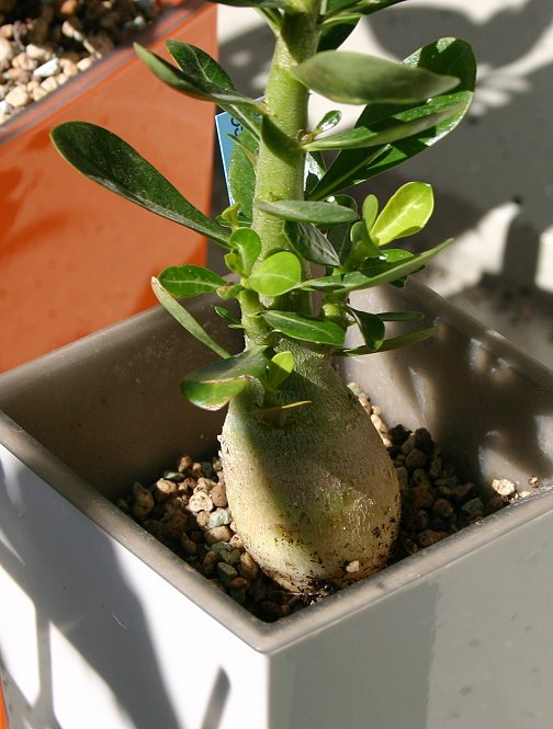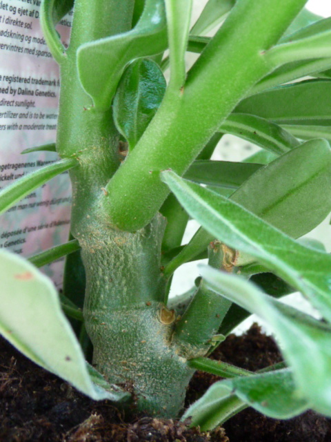 bei der REWE-Adenium ist es schwer zu sagen ob die gepfropft ist, wenn ja, dann sind es so saubere Pfropfstellen wie ich sie noch nie gesehen habe . Ich tippe eher auf eine Stecklingspflanze, da die unteren Blätter aus dem Substrat kommen und auch knapp darüber hat die Pflanze die volle Belaubung – bei dieser Größe dürften da eigentlich keine Blätter sein .