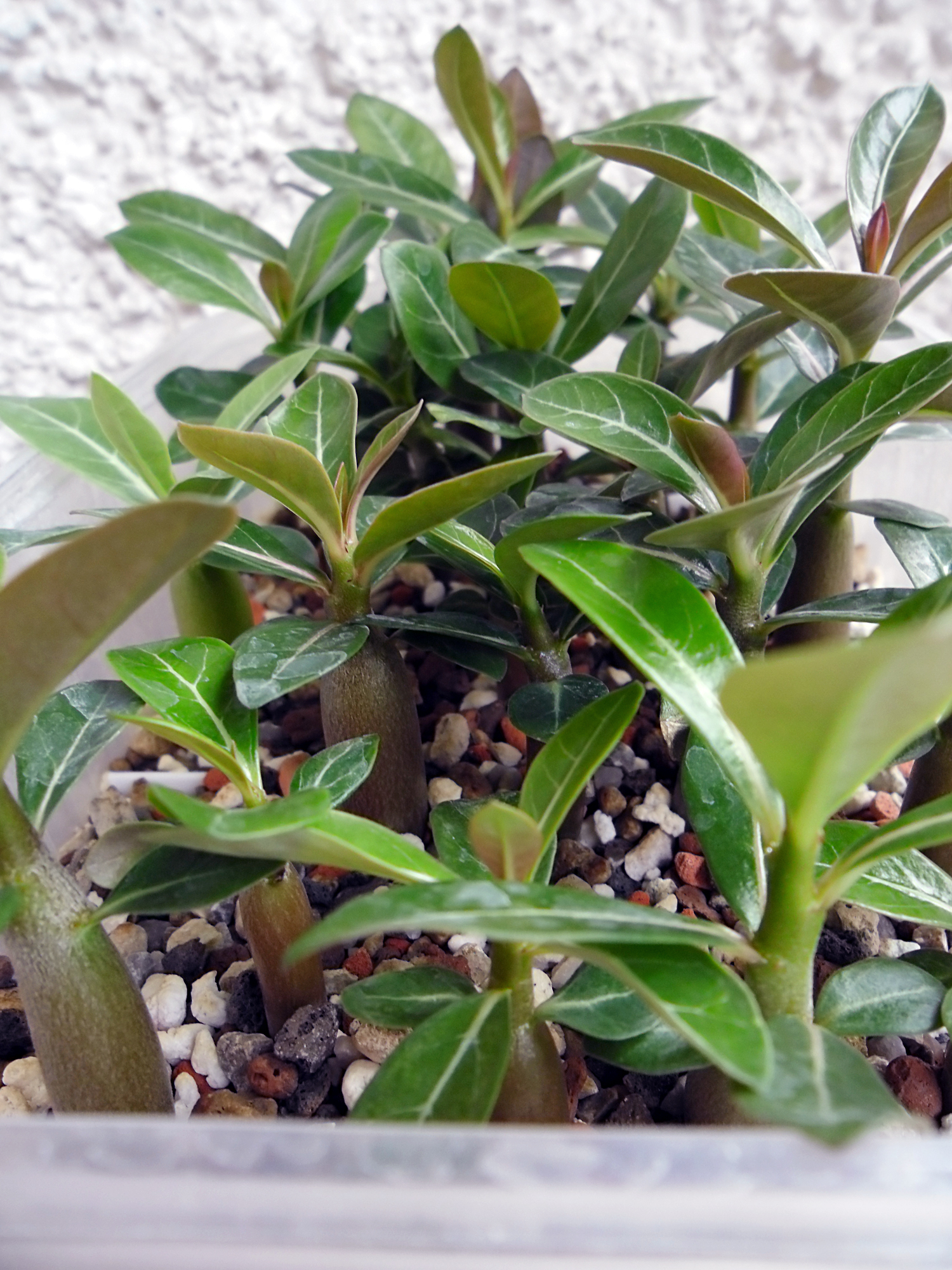 Juhu übrigens, meine matschige Wüsti hat wieder einen ganz festen Stamm! War tatsächlich zu wenig Wasser. Problem ist nur: Das Erlebnis, dass so eine gesund aussehende Wüsti einen völlig matschigen Stamm haben kann, hat nachhaltige Folgen: Ich habe jetzt eine Wüsti-Stamm-Quetsch-Zwangsneurose entwickelt und habe dauernd das Bedürfnis, zu kontrollieren, ob alle noch einen gesunden, festen Stamm haben.