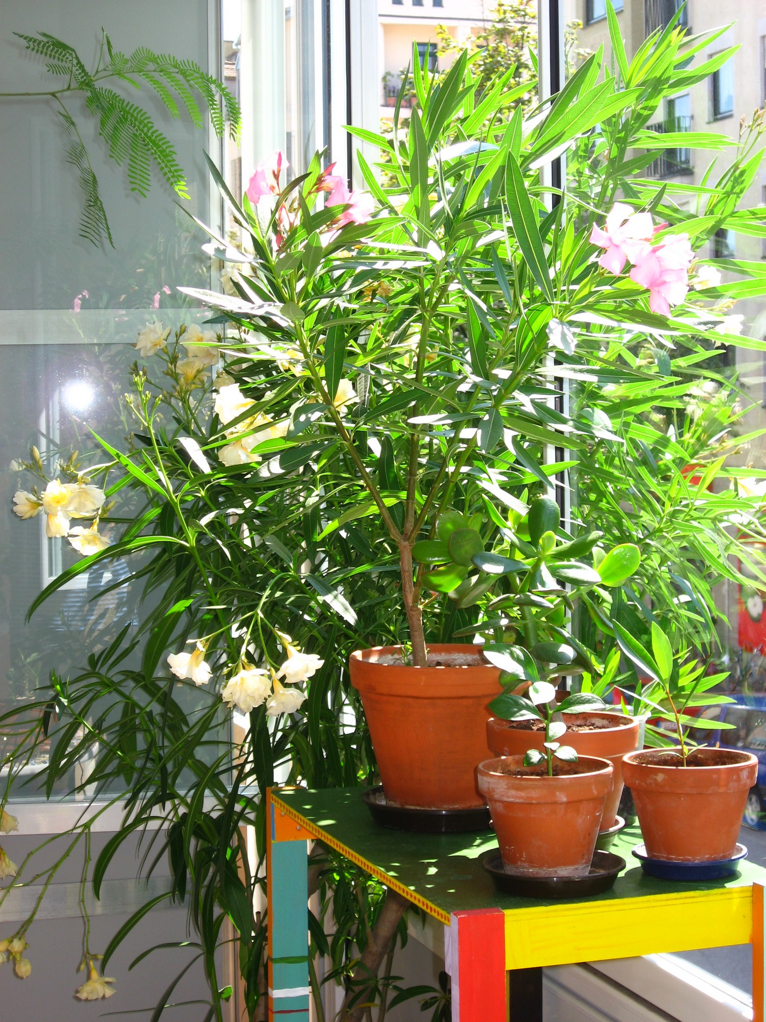 im sommer bin ich großer fan von meinen oleanderstöcken, mein gelber ist 2 meter hoch und muss noch eingewintert werden. vor allem wenn sie blühen ist die loggia ein blütenmeer und duftet.
