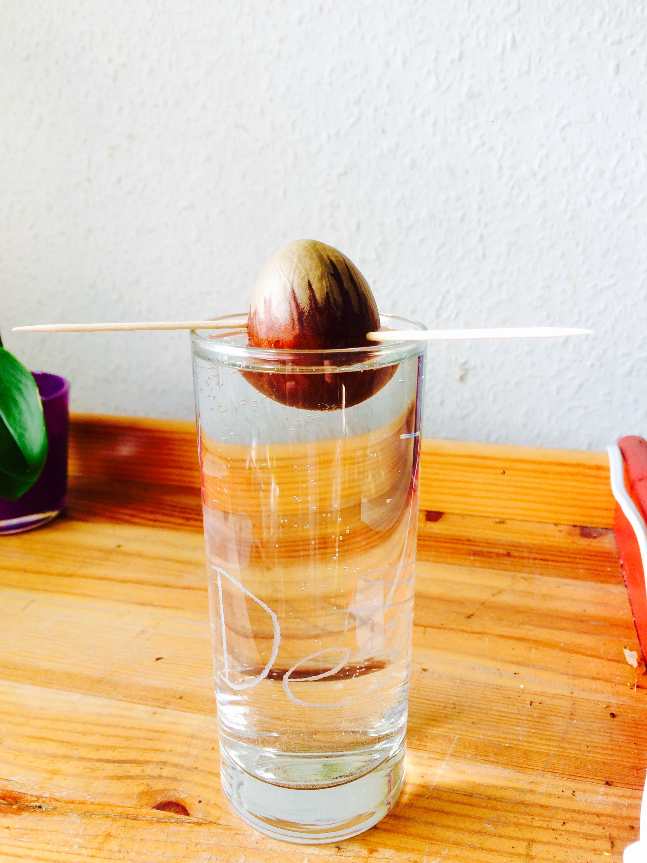 Eine Avocado gekauft, den Kern vorsichtig entnommen, gereinigt und mit Zahnstochern und Wasser versorgt.