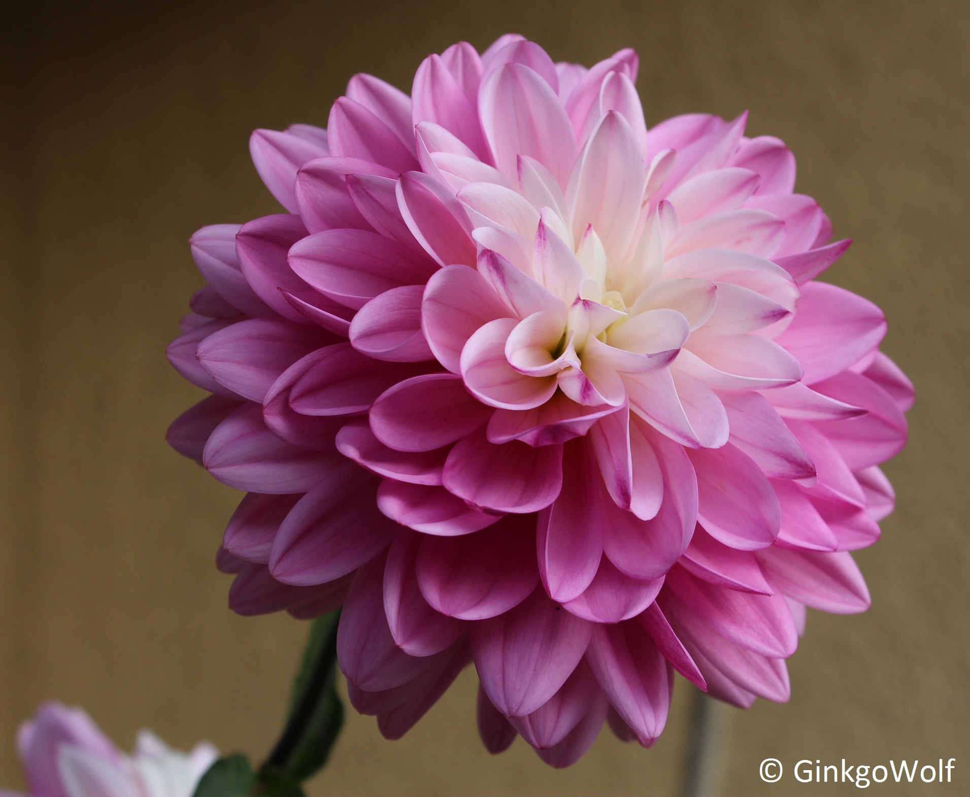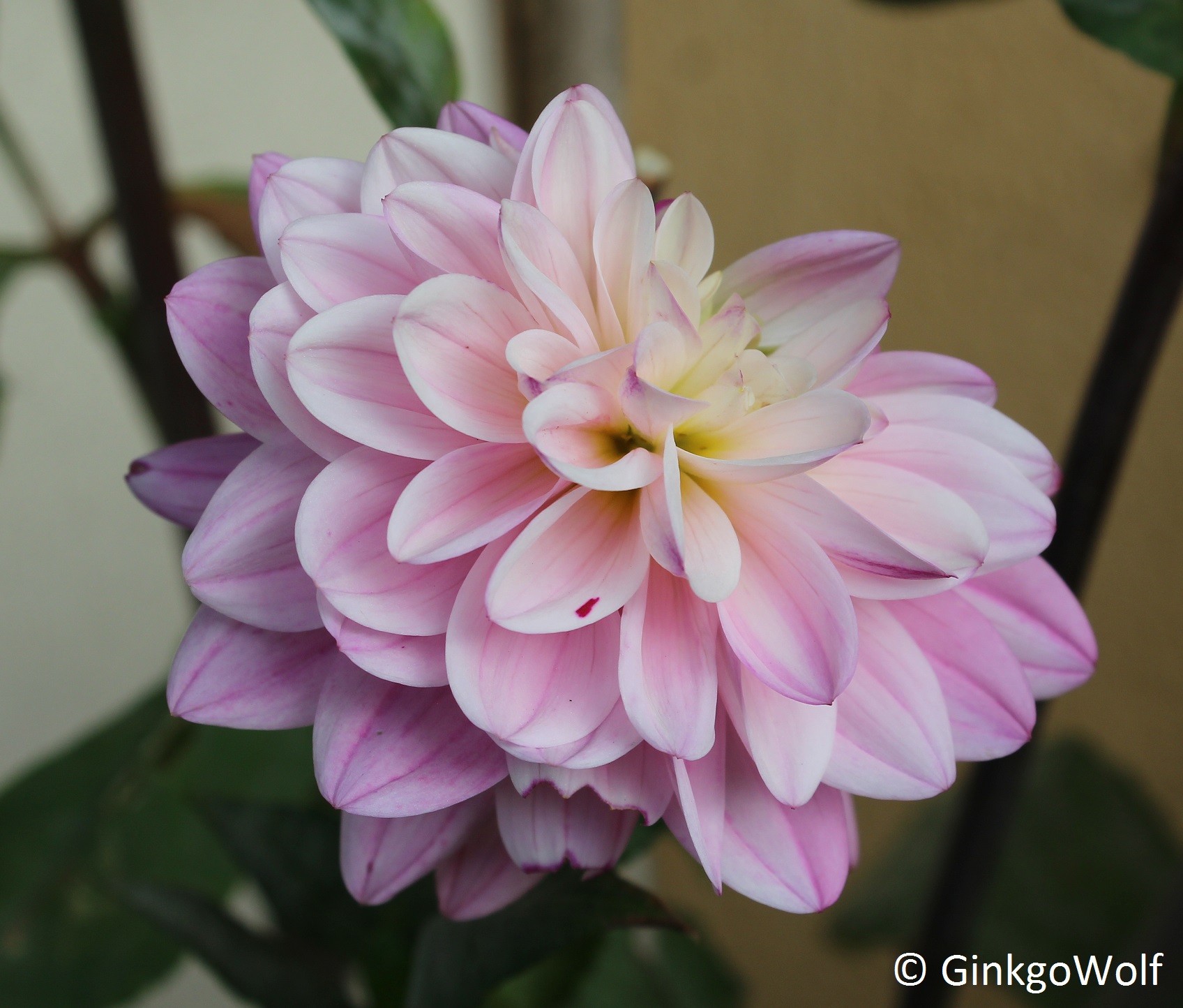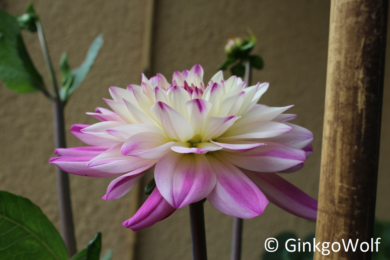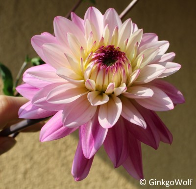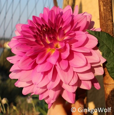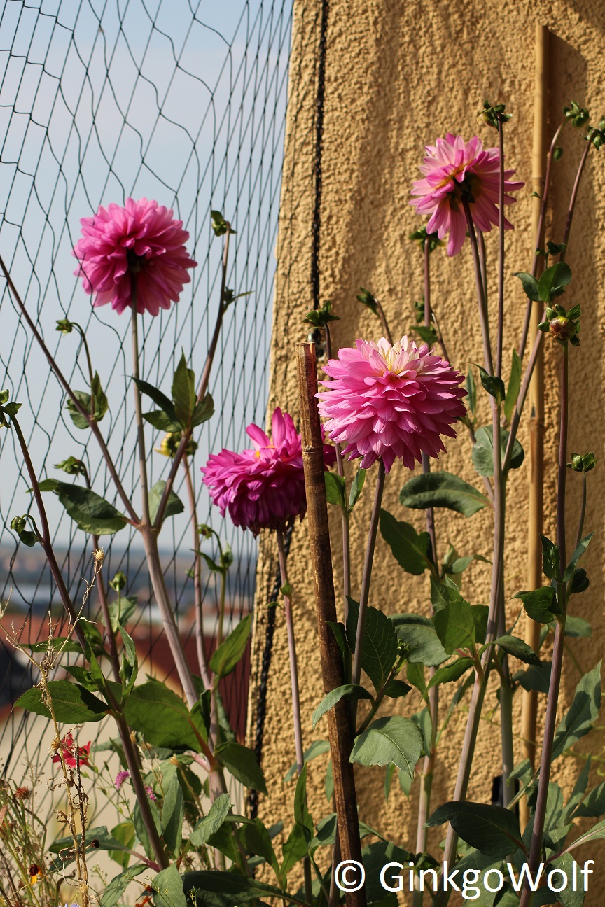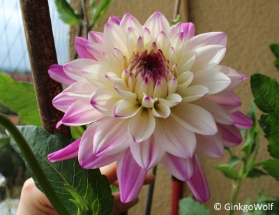 Ich liebe Dahlien, seit ich sie auf Gartenschauen in ihrer Hülle und Fülle kennen gelernt habe. Dabei mochte ich (und mag ich bis heute!) besonders die einfachen (ungefüllten) Blüten bzw. die großen (ich nenne sie mal) Schaudahlien wie die Kaktusdahlien. Auf meinem Balkon musste natürlich auch eine Dahlie her! "Ausgesucht" hatte ich mir eine ganz bestimmte: 'Edge of Joy', eine hübsche weiße Zwergdahlie mit gelben Röhrenblüten in der Mitte. Also habe ich mir im Baumarkt nebenan eine Knolle der Sorte geholt und eingepflanzt. Die Überraschung war allerdings groß, denn die Blüten waren ganz und gar nicht wie die 'Edge of Joy': sie waren gefüllt! Die Farbe war auch anders, sie hatte viel rosa.
