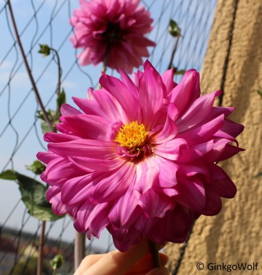 Bis meine Dahlie ihren richtigen Namen "gefunden" hat, heißt sie aufgrund ihres Wohnortes "Balkonqueen". Diesen Namen hat ihr eine sehr nette Userin dieses Forums gegeben und er passt auch zu ihr. Ich habe keine Rosen, die ihr den Königinnen-Titel streitig machen könnten, also ist sie die Queen meines Balkons.