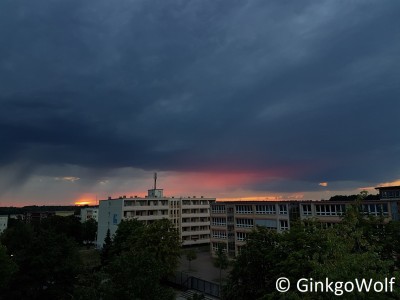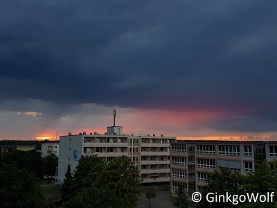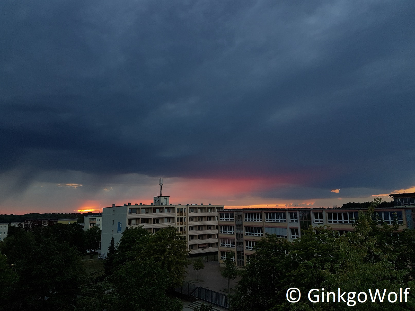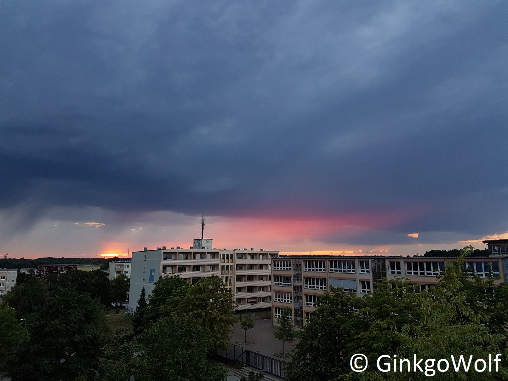 Den hatten wir am 21. August 2020 und er war insofern bemerkenswert, dass sich das Abendrot der untergehenden Sonne direkt unter eine heranziehende Regenwolke gelegt hatte.