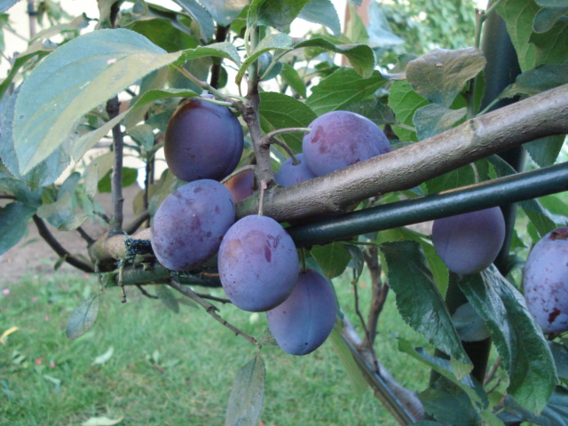 es ist Ende August, und die Wangeheims Frühzwetschge hat sich schön ungefärbt. Sie ist noch nicht reif, hat aber einige Früchte angesetzt. Leider sind es noch nicht so viele, dass es für einen Kuchen reichen würde, aber einige zum Naschen sind doch auch nicht schlecht. Der Baum hat dieses jahr etwa 70 cm Längenwachstum gehabt.