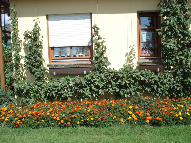Das ist die Palmette im Sommer 2008, die linken beiden Triebe sind leider noch nicht komplett bis unters Dach gewachsen