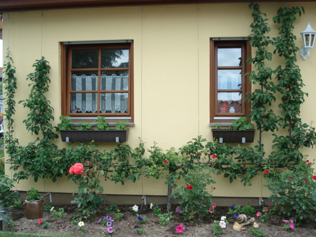 Am Haus unterm Küchenfenster steht mein ältester Spalierbaum auf meinem jetzigen Grundstück. Er wurde angelegt als Armleuchter-Palmette. Dabei wachsen senkrechte Triebe an einen waagerechten Kordon. Das Schwierige hieran ist, dass zunächst die am weitesten aussen vorgesehenen senkrechten Triebe wachsen müssen. Bevor die mittleren, am nächsten dem Mittelstamm wachsenden sich entwickeln dürfen, lasse ich gar noch einen Mitteltrieb wachsen, was durchaus geht, aber alles schwieriger macht, dann habe ich erhebliche Probleme, die Armleuchter-Palmette auf voller Breite zu entwickeln. Ich habe hier sechs senkrechte Triebe vorgesehen.