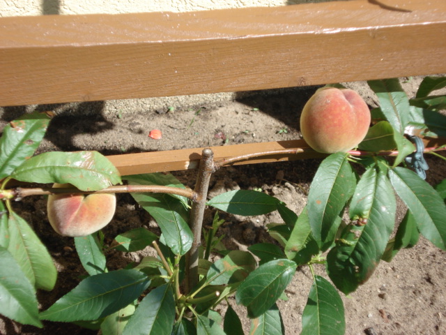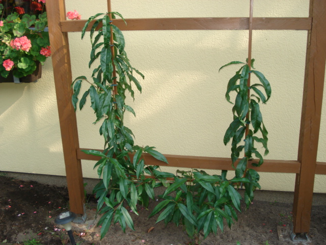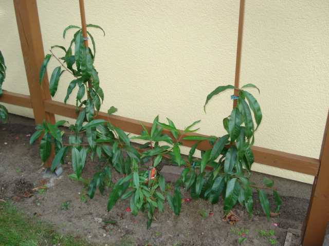 An dieses Spalier habe ich 2 Pfirsichbäumchen gepflanzt und wie bei mir üblich die Mtteltriebe gekürzt. Ein Pfirisch der Sorte Red Heaven und einen der Sorte South Heaven. Ich hatte jedoch das Glück, dass ich weiche vorhandene Seitentriebe gleich nutzen konnte, um das U zu beginnen. An beiden Pfirsichbäumchen hatte ich wenige Blüten, insgesamt 3 davon entwickelten sich zu Früchten.