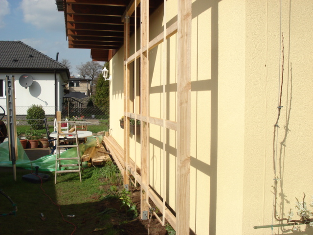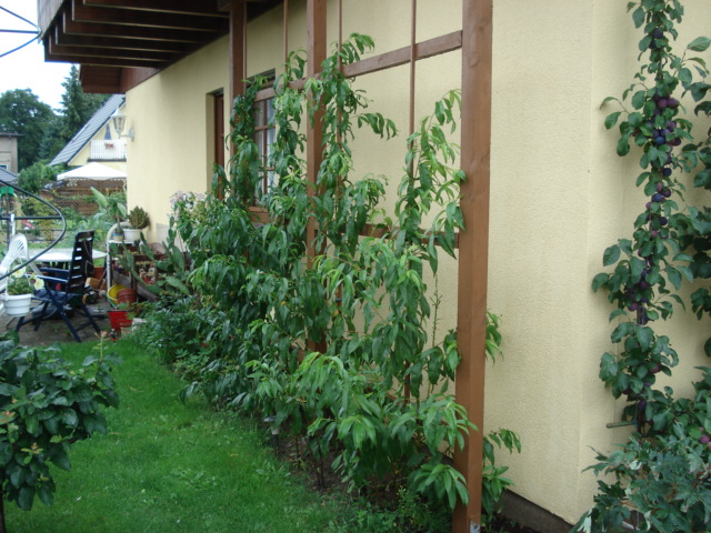 Schon lange wollte ich auf meinem Grundstück Pfirsiche anbauen, nur wusste ich nicht, wo. Im Frühling 2008 habe ich mir dann überlegt, ich könnte Pfirsiche an an einer Westwand an einem U anbauen. Also habe ich mir das passende Lärchenholz, Verbinder und Schrauben besorgt. Drei Pfosten wurden auf 2,40 meter auf je einen Betonsockel geshraubt, entsprechend verbunden und mit Leisten bespannt.
