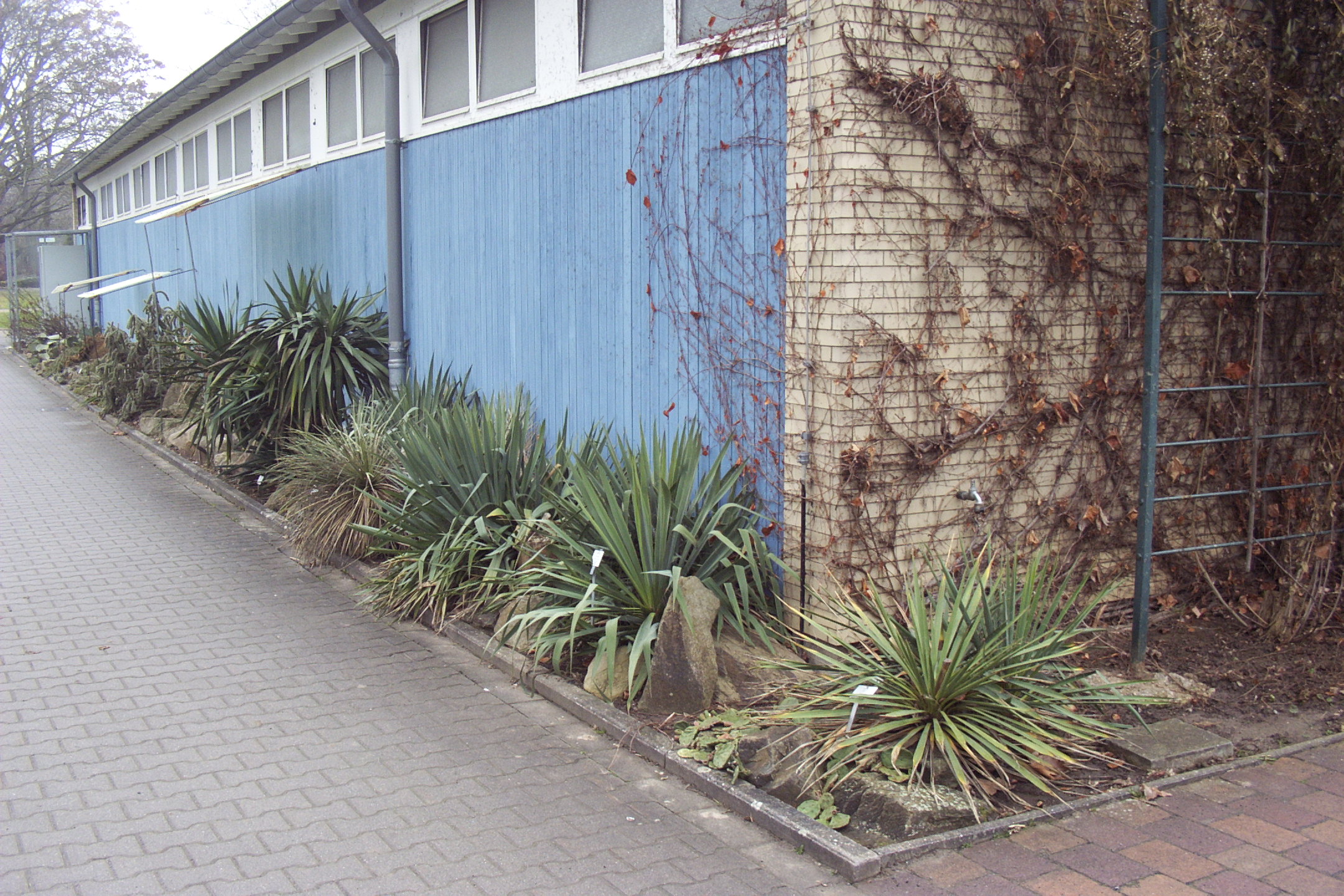 Im Außengelände des Botanische Gartens in Mainz befindet sich eine schmale Rabatte, die mit winterharten Exoten bepflanzt ist. Die folgende Liste soll festhalten, welche davon mit einem zusätzlichen Regenschutz versehen sind, und welche nicht - da das ja Anhaltspunkte für den eigenen Garten bietet.