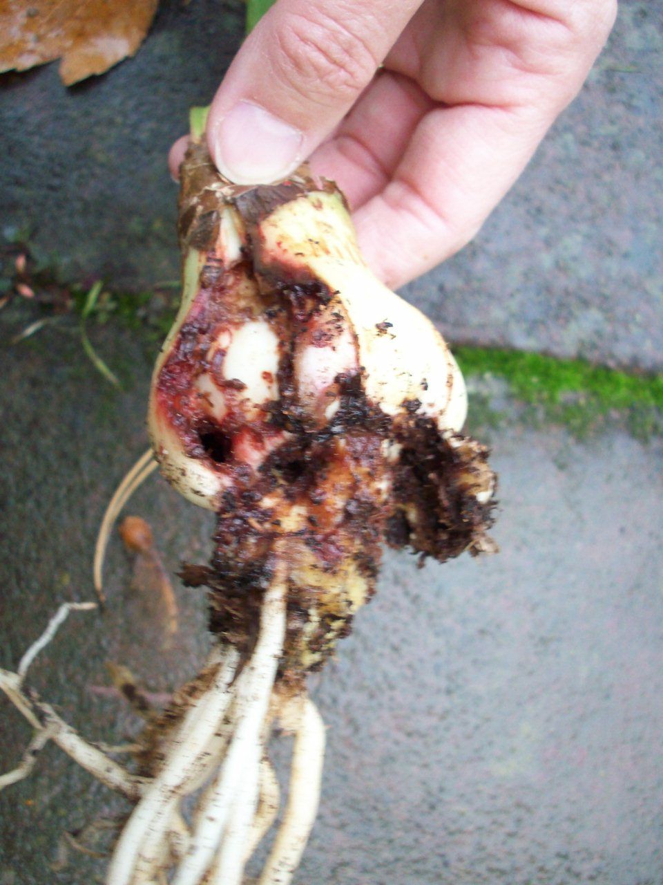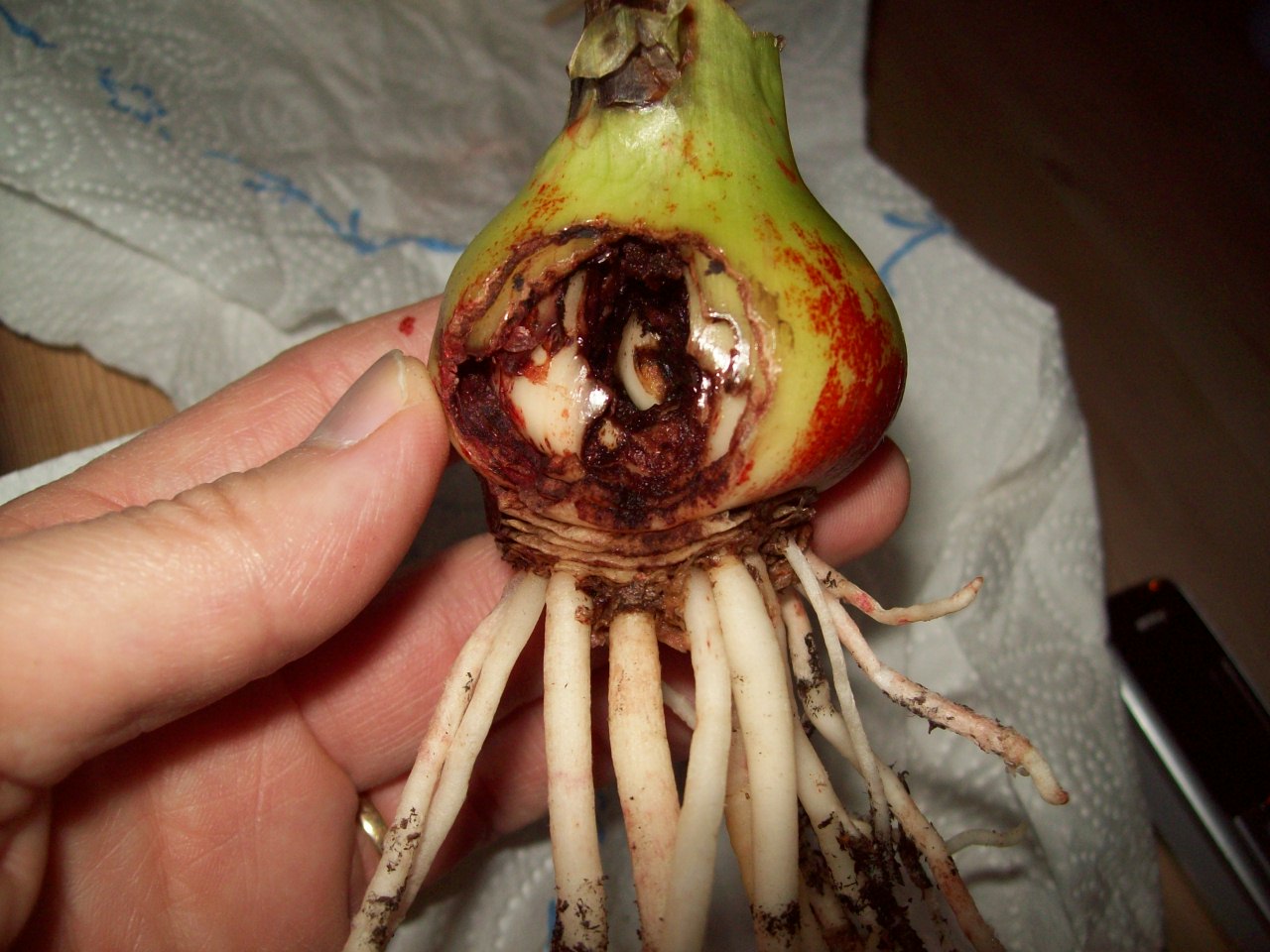 Ich habe die schadhaften Stellen herausgeschnitten und gehofft, dass ich die Zwiebeln soweit retten kann, dass sie Tochterzwiebeln bilden und dann wieder blühen.