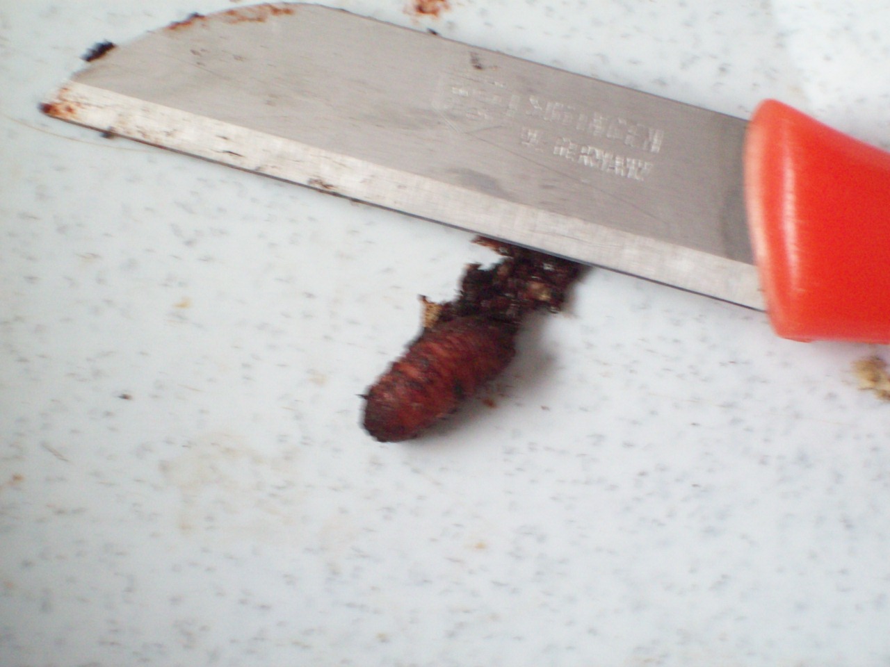 Ich habe sie zu Hause ausgespült und gesäubert, und dabei zwei dicke Maden entfernt.