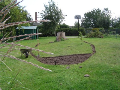 Da unsere Kinder nun groß sind und der Walnussbaum gefällt werden musste, wollte ich die große Rasenfläche anders gestalten und begann ein Staudenbeet anzulegen. Es hat eine ovale Form rund um den Baumstamm und Ausmaße von 10 x 5m.
