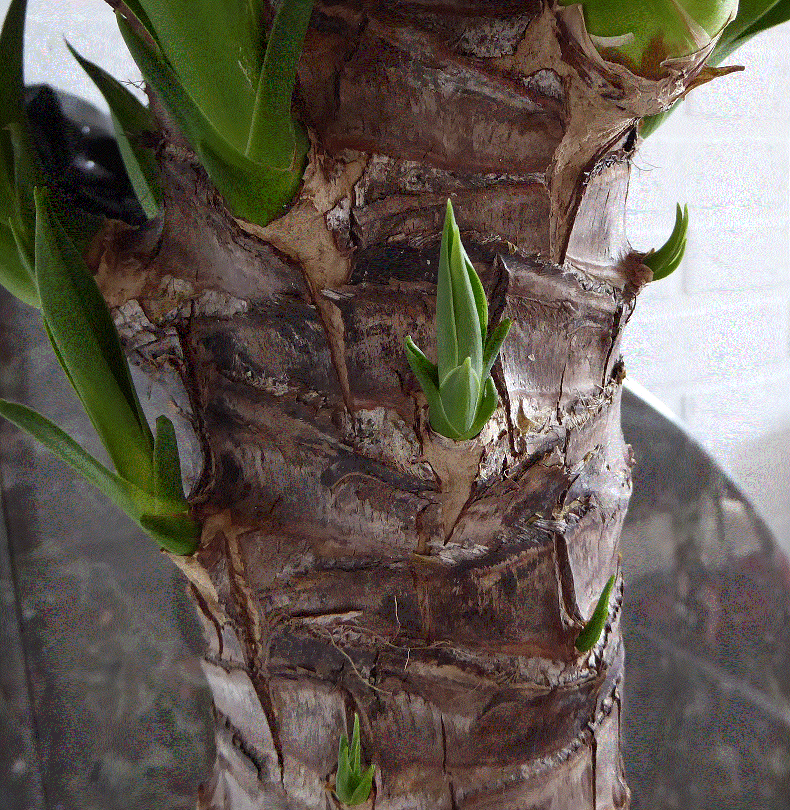 (insgeheim hatte ich gehofft dass sie mal blüht, aber das wird wohl auf absehbare Zeit nix)Was mir auch aufgefallen ist, ist dass im Winter die Kälte allein nicht das Hauptproblem ist, sondern die Feuchte. Vor allem bei den kleineren sind einige Triebspitzen weggefault (kamen aber danach alle wieder), besonders bei einer die ganz ungünstig stand (so halb unter einem Pavillion, wodurch der ganze Regen vom Dach draufgelaufen ist). Bis auf ca. 5 Tage im Januar standen sie alle durchgehend ungeschützt draußen, komischerweise hat der verregnete Winter die 3 kanarischen Dattelpalmen, die genauso behandelt wurden, überhaupt nicht gestört