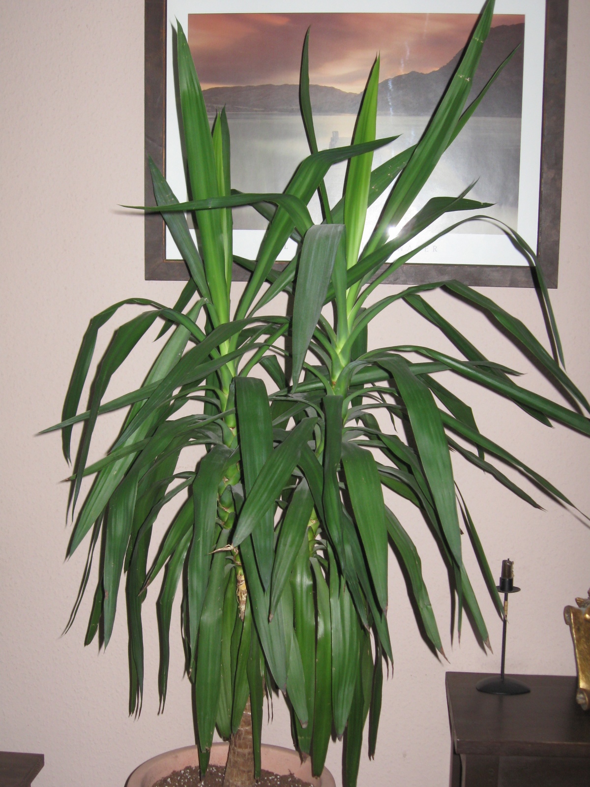 also ich hab von meiner Vorbesitzerin eine Yucca im Garten. die sich ganz schön breit macht und jedes Jahr traumhaft blüht. Die hat einfache grüne Blätter und der Blütenstand ist ein langer "Stiel" mit schönen weißen Blüten.