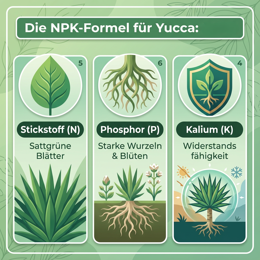 Ein guter Dünger liefert die drei Hauptnährstoffe Stickstoff (N), Phosphor (P) und Kalium (K) in einem ausgewogenen Verhältnis. Für Yucca-Pflanzen hat sich eine leicht phosphorbetonte Formel als ideal erwiesen.