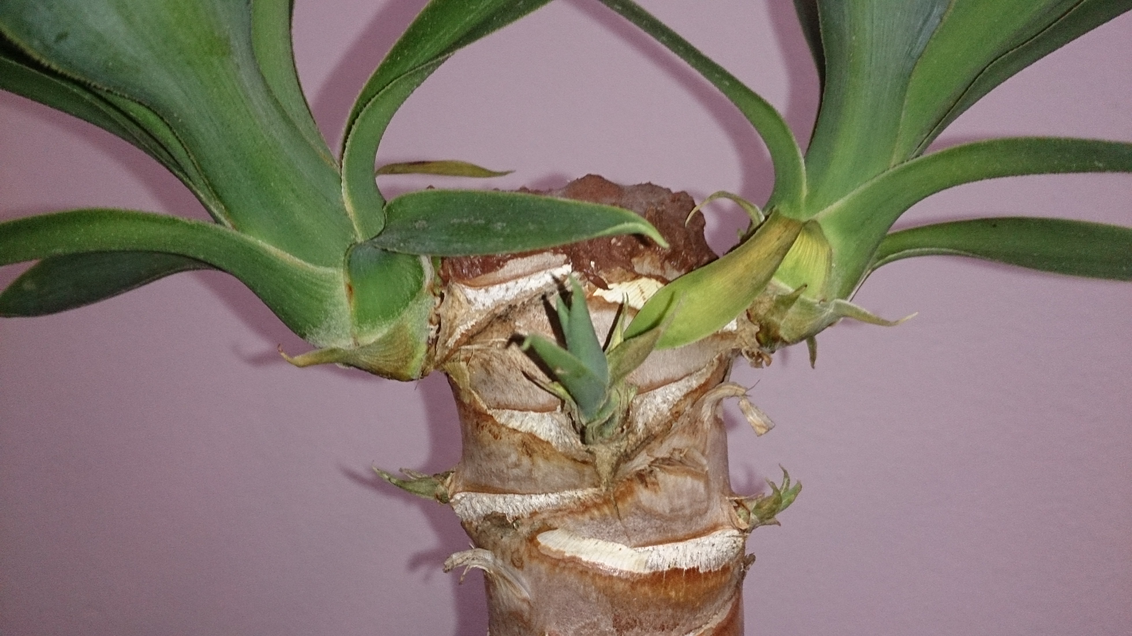 Und zwar hab ich im Frühling eine größere Yucca elephantipes geköpft; 2 Stammteile sind dabei rausgesprungen. Die 2 Teile hab ich im Wasser bewurzelt und dann, im Laufe des Sommers, in 2 Töpfe gepackt. Beide haben auch ordentlich ausgetrieben.