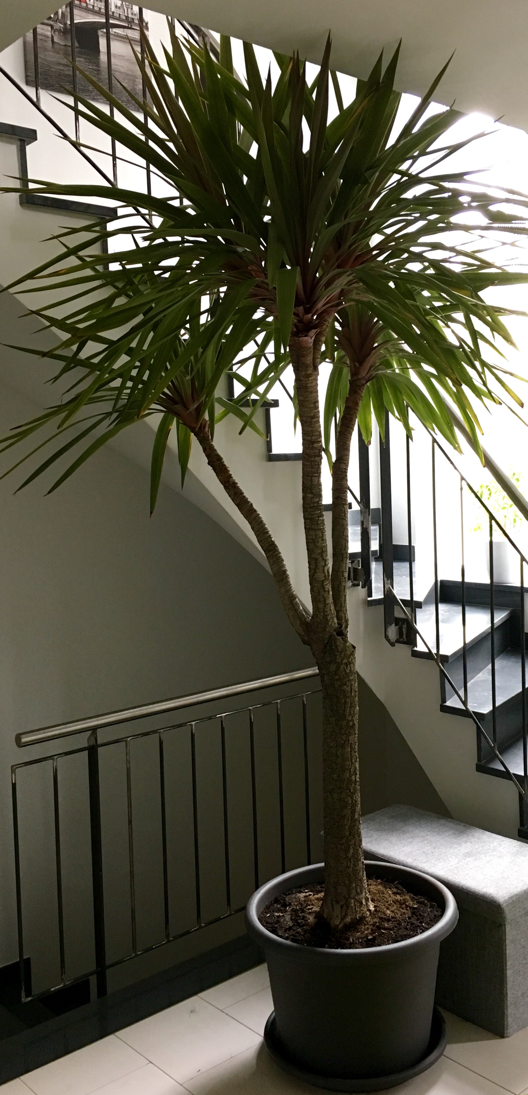 Es gibt viele Arten und Sorten (Züchtungen) von Yucca und auch von Cordyline (Keulenlilie) oder Drachenbäumen, die sich teils recht ähnlich sehen. Aber ich bin mir schon recht sicher, das dies eine Cordyline ist. Die Blätter einer Yucca elephantipes ('Standart-Yucca') sind etweas breiter und haben keine rötliche Basis. Das Ringmuster im oberen Bereich des Stammes und auch die abgeschnittenen Blattbasen sind typisch für die Cordyline, ebenso die etwas 'aufgerissene' Rinde im unteren Bereich. Auch der sich seitlich heraus schiebende Blütenstand spricht mit seiner Form für Cordyline. Und auch die Einzelblüten unterscheiden sich schon deutlich (wenn auch nicht mehr auf dem Foto vorhanden).