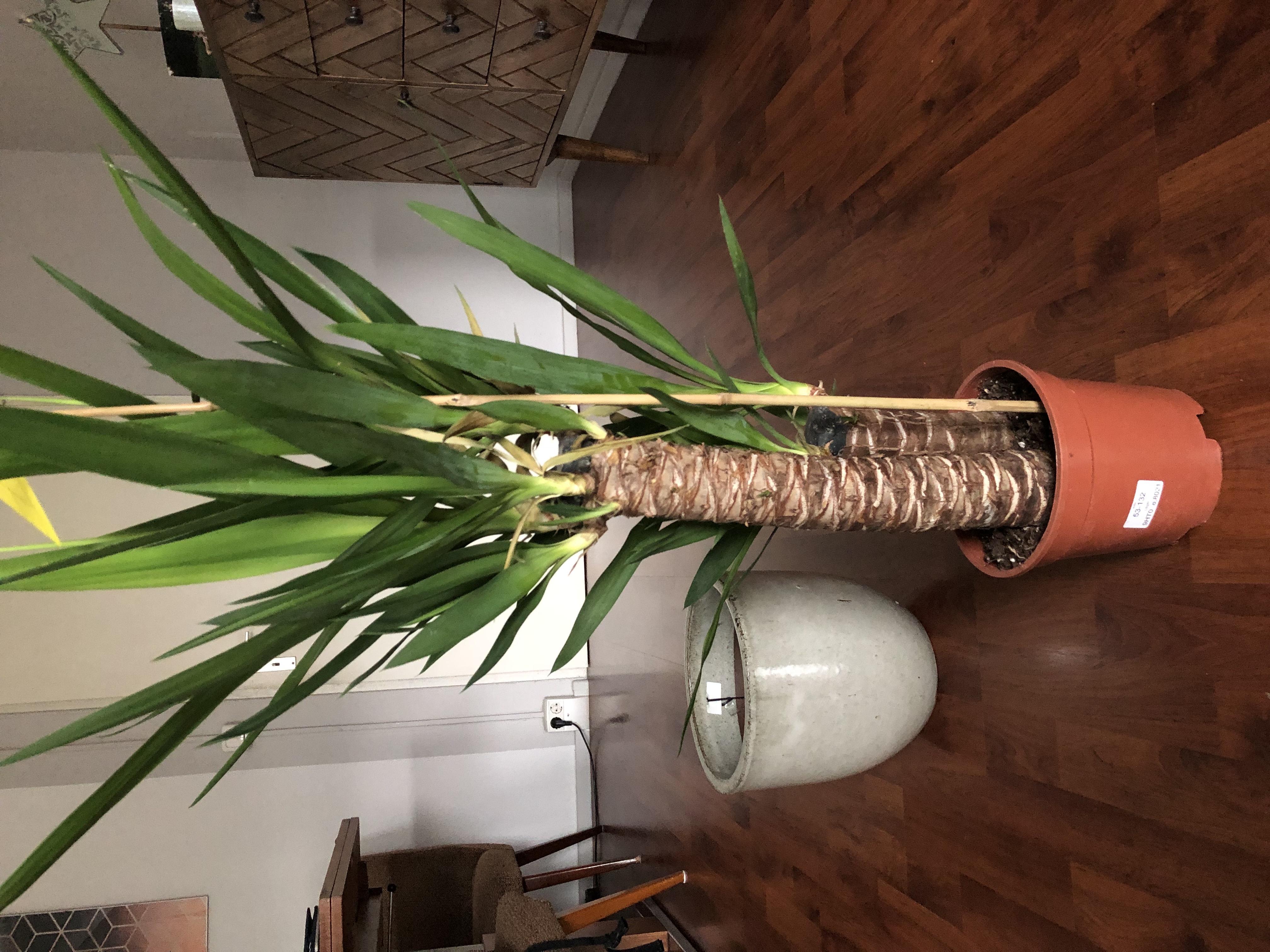 Die Yucca ist ca. 90cm hoch (2Stämme). Der Topf 15cm hoch mit einem Durchmesser von 15cm (Ist der vielleicht zu klein?).