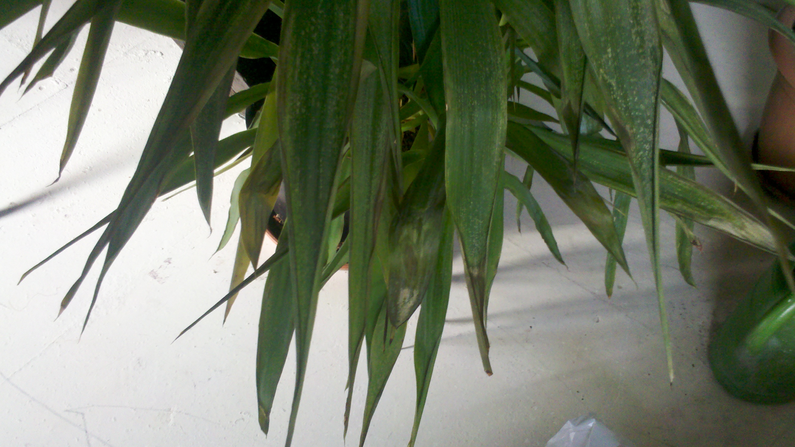Vor drei Tagen hat dann die Yucca von meinem Kumpel angefangen, von den Blatträndern her auszutrocknen, etwas bläulich/bräunlich zu werden, während in den Blattmitten helle Flecken aufgetreten sind. Es sind alle Blätter etwa gleichermaßen betroffen, siehe Bilder.