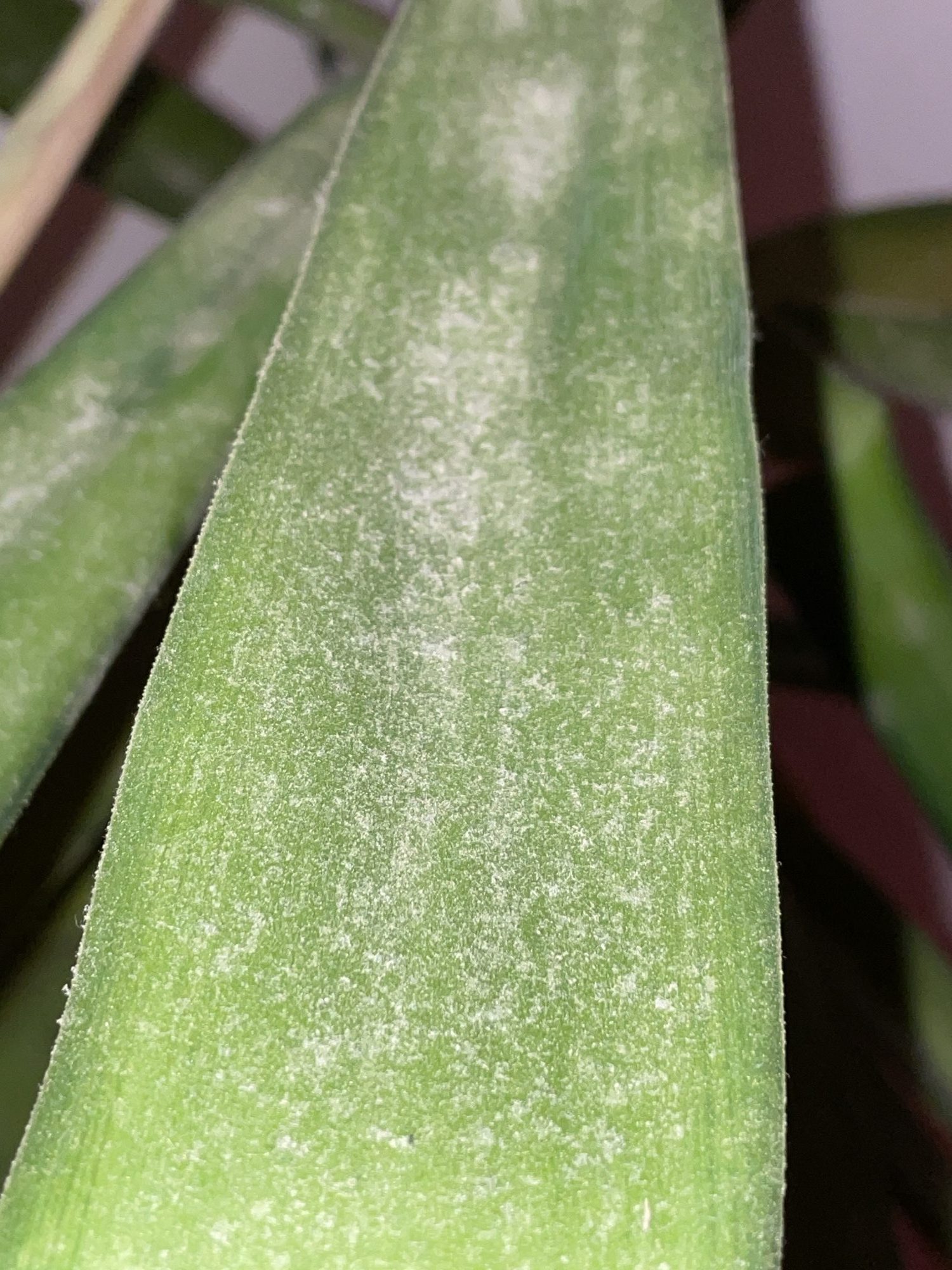 An den Blattspitzen befinden sich Webartige Netze, ich kann jedoch bei bestem Willen keine Tiere auf der Pflanze erkennen. Der Belag lässt sich abwischen.