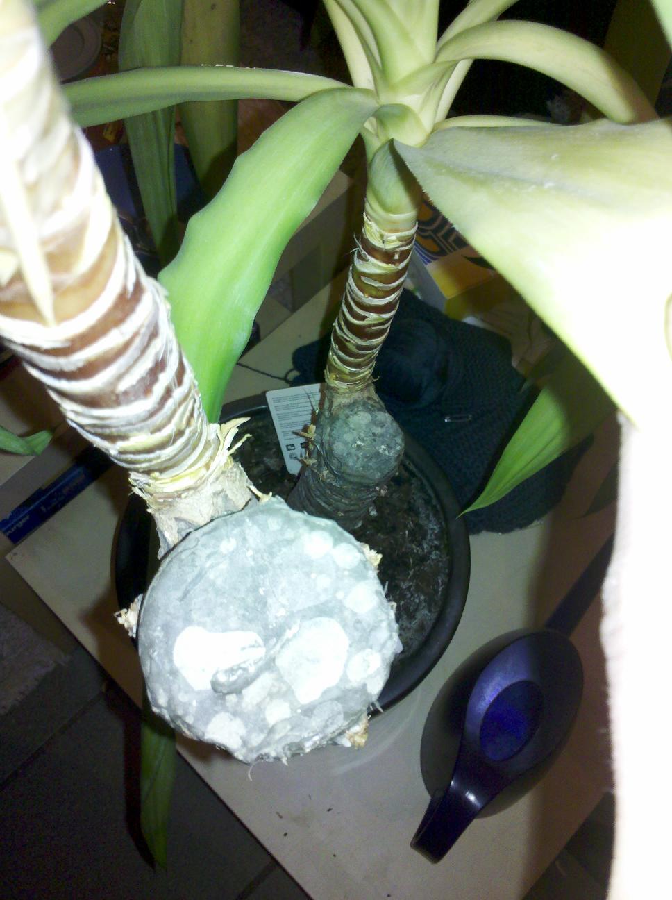 Relativ zeitgleich ist mir aufgefallen, dass einer der beiden Stämme schrumpelig aussieht. Ich habe ihn abgetastet und die oberen 2/3 sind weich. Dabei ist die Rinde aufgeplatzt und es sifft nun an dieser Stelle raus. Ich hab erstmal Zewa drunter gelegt, damit das nicht alles in die Erde kommt.